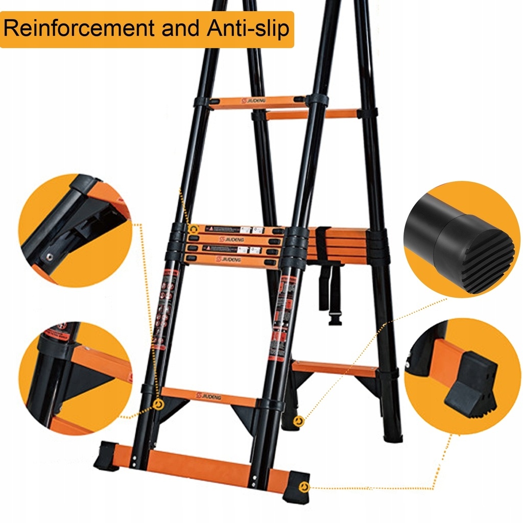 Сходи характеризується професійною конструкцією, яка значно підвищує стабільність під час використання. Професійний телескопічний механізм дуже зручний для використання, що дозволяє швидко та просте регулювання висоти. Просто потягніть його тимчасово, почуйте клацніть і підтвердьте, що ліва та права блискавка знаходяться в положенні "заблоковано", а потім ви можете безпечно використовувати його