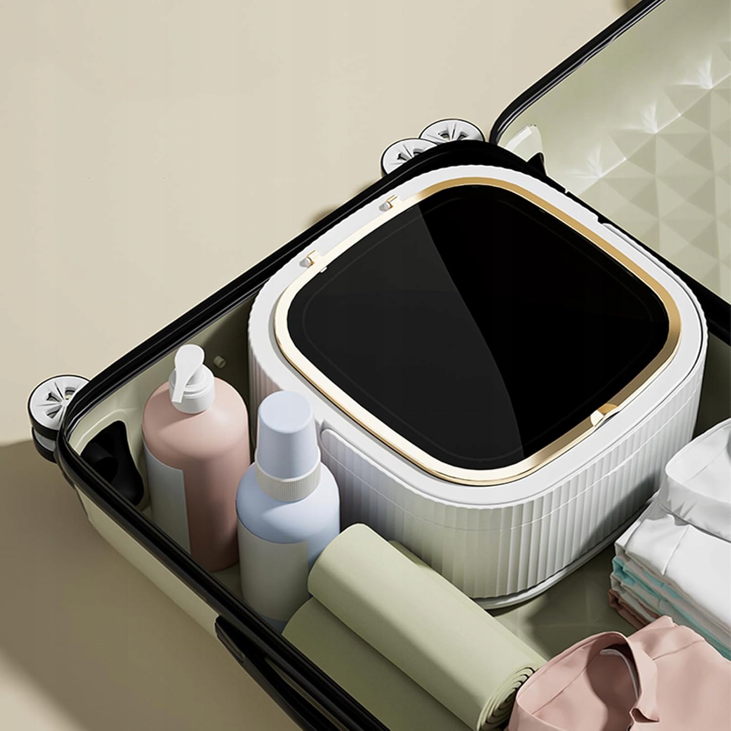 Нова модернізована портативна пральна машина приймає ультра-дрібну складну конструкцію, легку складання, ідеально підходить до кута валізи, незалежно від того, чи це коротка подорож чи довга подорож, вона може стати інтимним супутником у валізі, завдяки тому, що очищає одяг, не є проблемою.