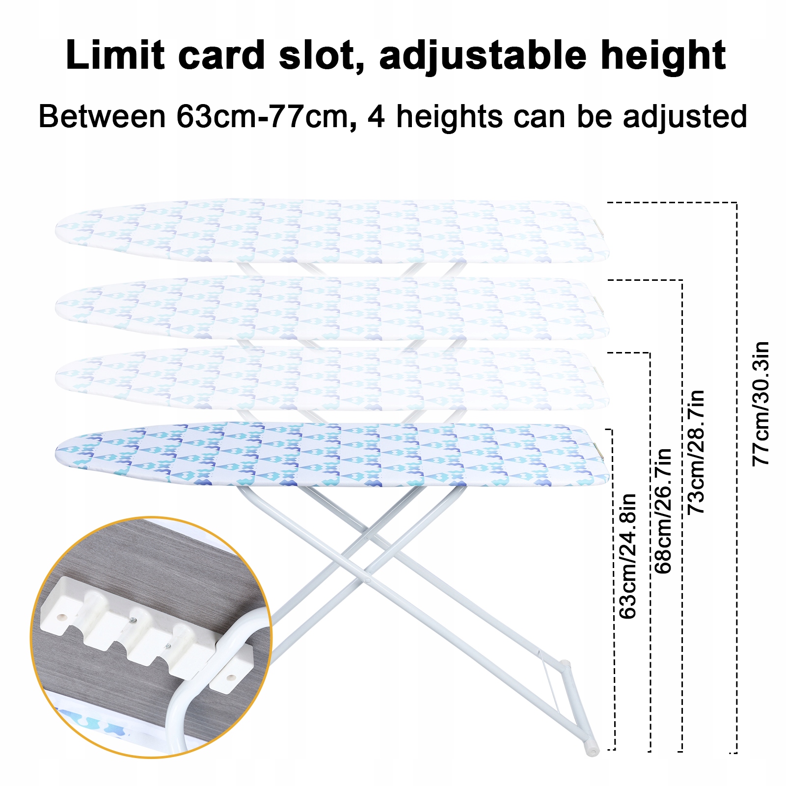 Збереження місця: складання прасувальної дошки на стільниці підходить для невеликих місць і дозволяє повне складання. Складання його випадково не пошкодить його, а високоякісний матеріал, щоб підтримувати термін експлуатації пристрою роками. Легко в магазині та має ідеальний розмір для обмежених просторів, таких як гуртожитки або квартира. Відкрита прасувальна дошка має 42,13 "L x 30.71" у x 11.81 "H. Адаптується до 4 різних висот, ви можете вільно відрегулювати висоту залежно від ваших потреб.