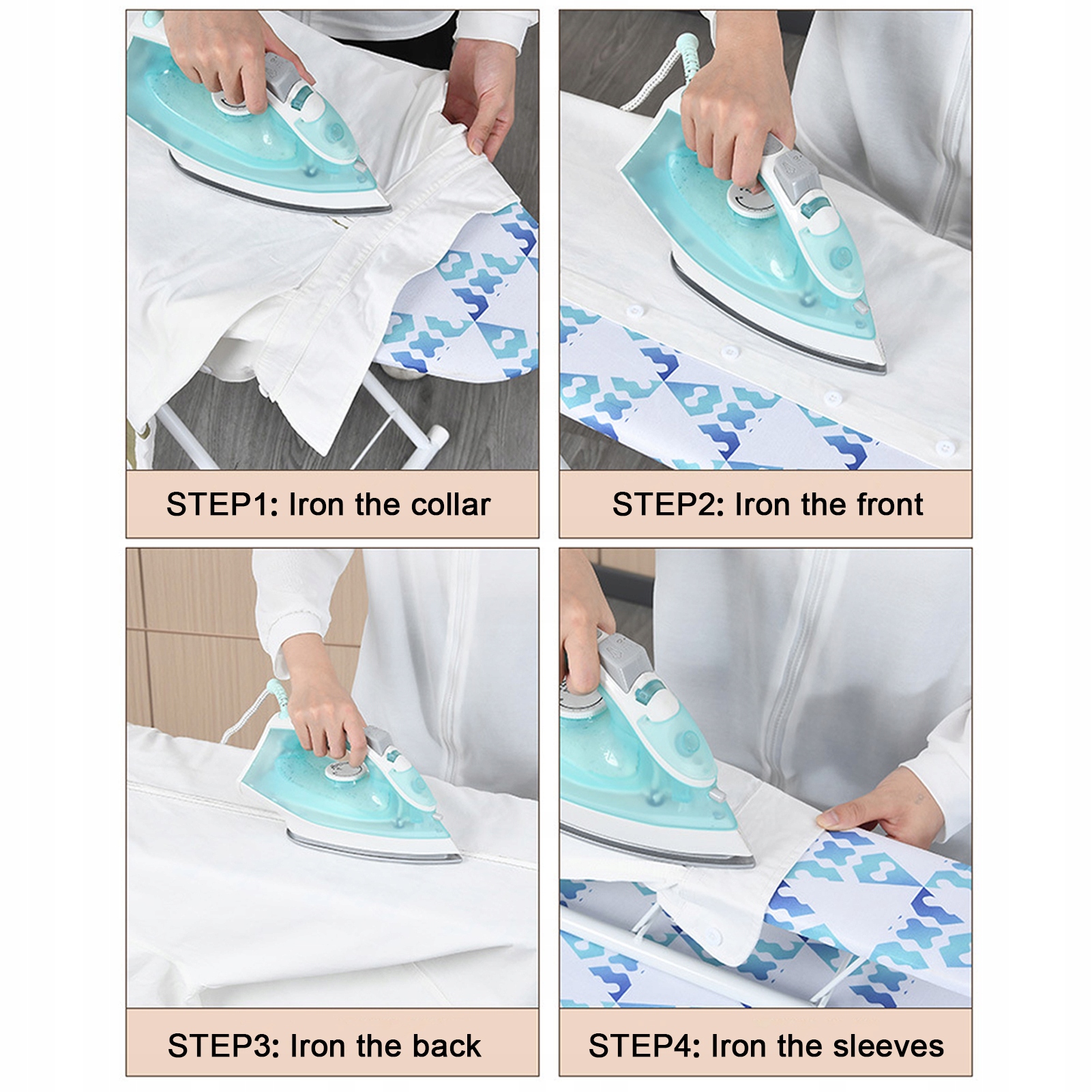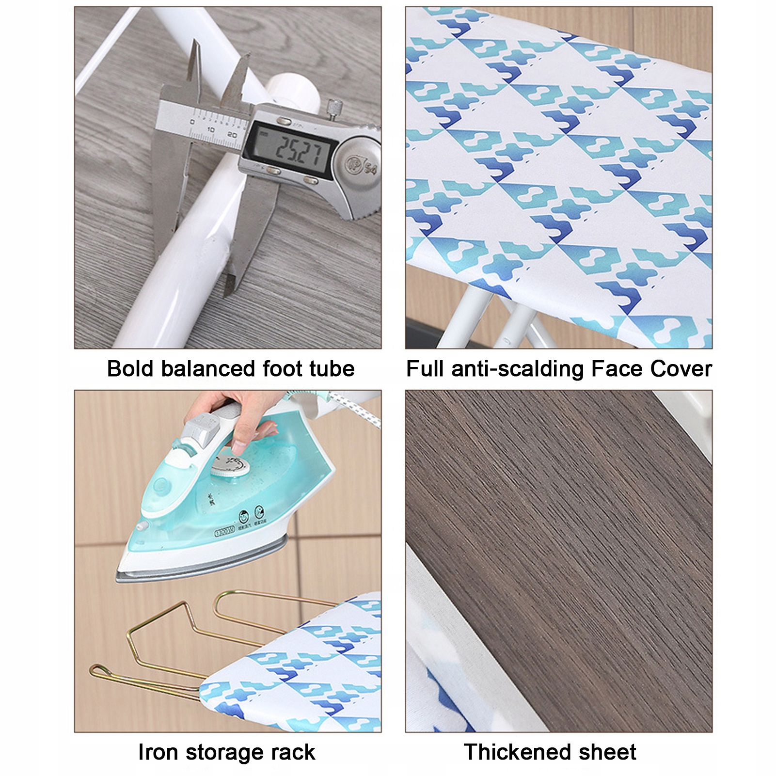 Легко скласти: Повноцінна прасувальна плата приймає спеціальний метод блокування, простий для відкриття та складання. Складена прасувальна дошка можна утримувати на місці, демплюючи складні петлі після складання, має ідеальну стабільність. Завдяки металевій рамці його можна використовувати як гачок для висячого на стінах та дверях або зберігання у вузьких шафах та ящиках, простих у магазині.