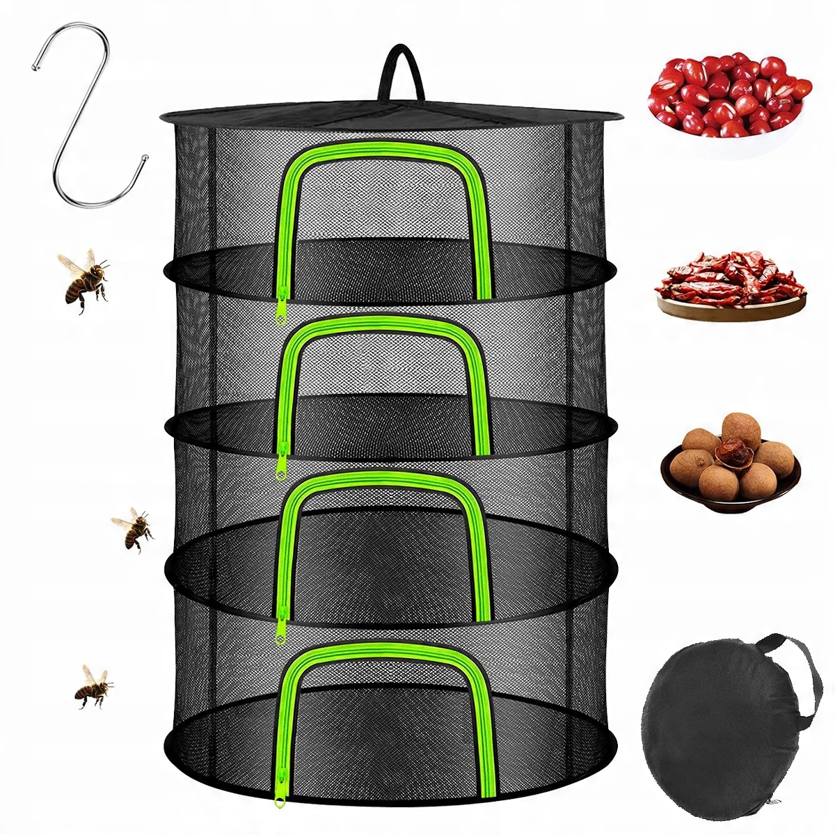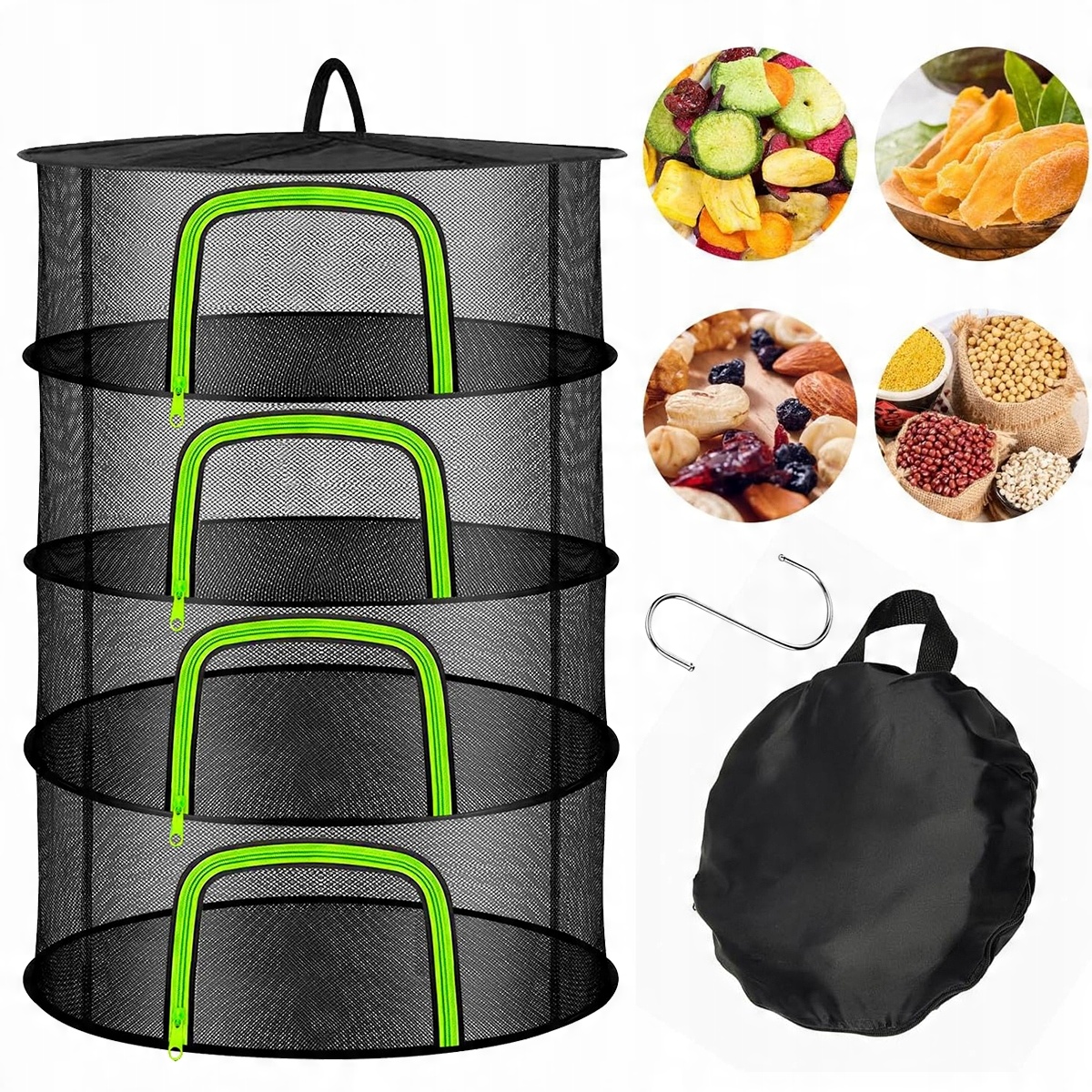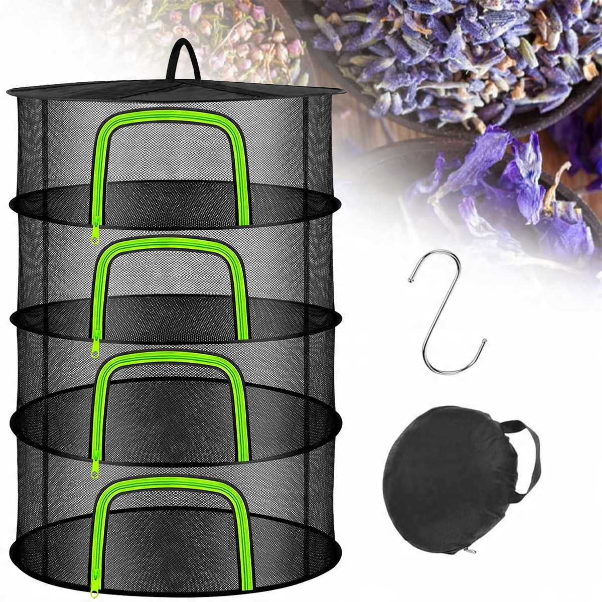 4-шарова сітчаста сушарка для підвісних трав, діаметр після розгортання-60 см, висота кожного шару-20 см, а загальна висота-80 см. Кожен шар пропонує багато місця для висихання багатьох рослин та трав. Кожен шар має незалежну блискавку, яку можна сортувати та сушити, щоб уникнути змішування. Вертикальна конструкція забезпечує дуже ефективне використання простору.
