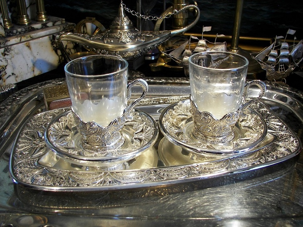 Запрошую придбати привабливий набір, що складається з двох склянок у кошиках, двох блюдець і підносу. Виглядає все це фантастично, візерунок на предметах т.зв філігрань. Кошики — лиття зі сплаву цинку, покрите сріблом. Блюдця виготовлені зі скла, оздоблені металевими декораціями, також зі сплаву цинку, покриті сріблом. Піднос листовий, обміднений і посріблений. Предмети ужитку. На іншому аукціоні ви побачите гарну цукорницю в тон. Це може бути чудовим подарунком, особливо з гравіюванням