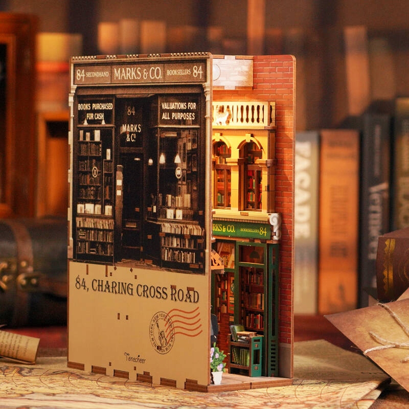 Книжковий куточок Tonecheer DIY Book Corner зображує сцену навколо Маркса & Co - історичний книжковий магазин, розташований на Чарінг-Кросс-роуд у Великобританії. Поєднання червоної телефонної будки та зеленої поштової скриньки створює стильну панораму. Френк, власник книжкового магазину, зосереджується на читанні листів американської письменниці Гелен Ганфф.