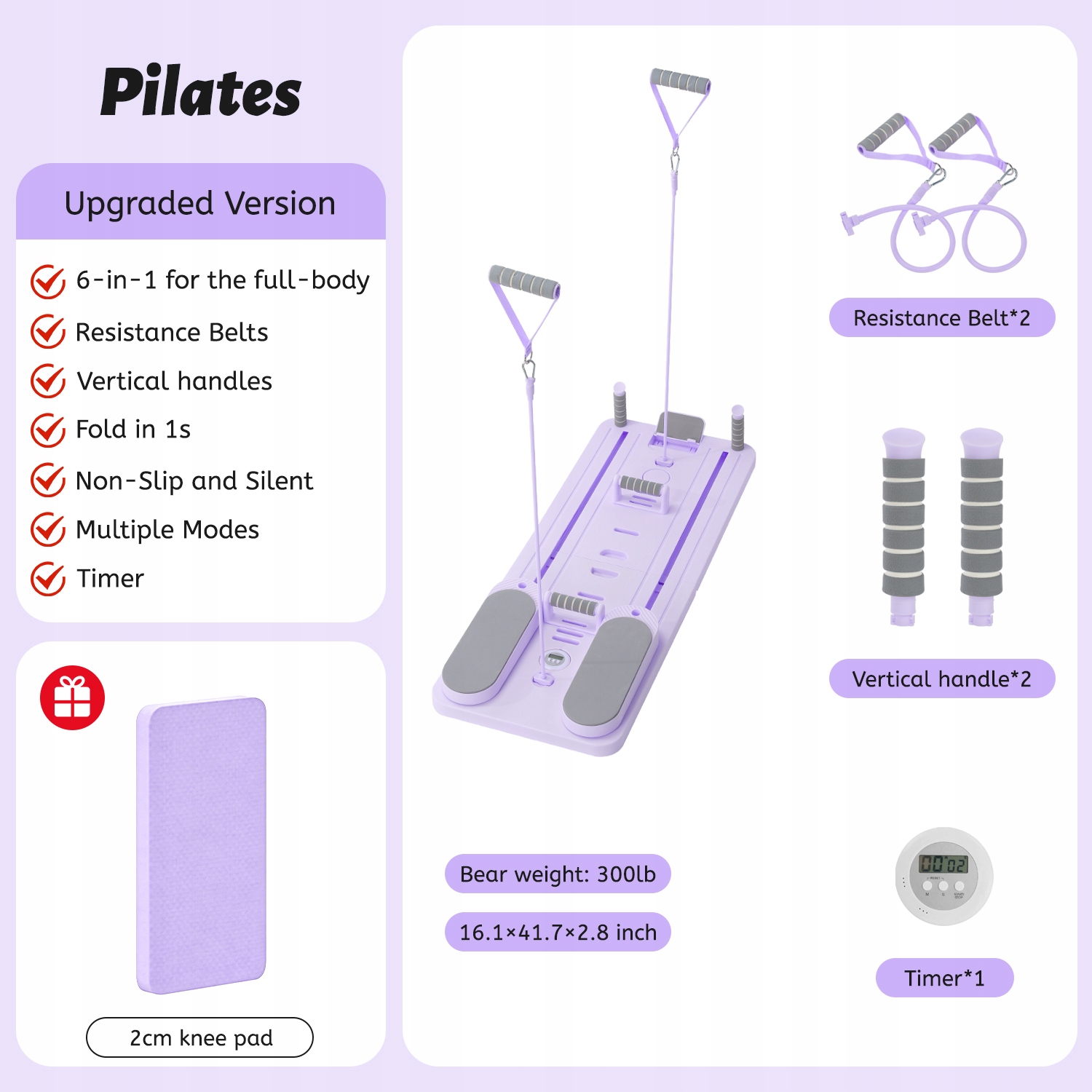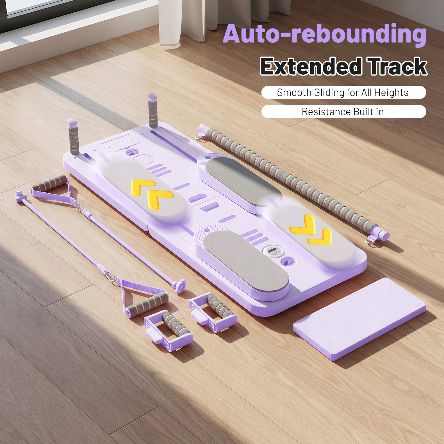 Ця багатофункціональна дошка для вправ поєднує тренування пілатесу, тренування з опірністю, вправи на віджимання та розтяжку йоги в одній компактній системі. Складна конструкція дозволяє легко зберігати, а розсувні подушечки та ремені для опору допомагають активувати основні м’язи та покращити силу, баланс і гнучкість.