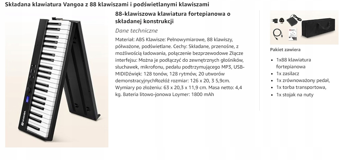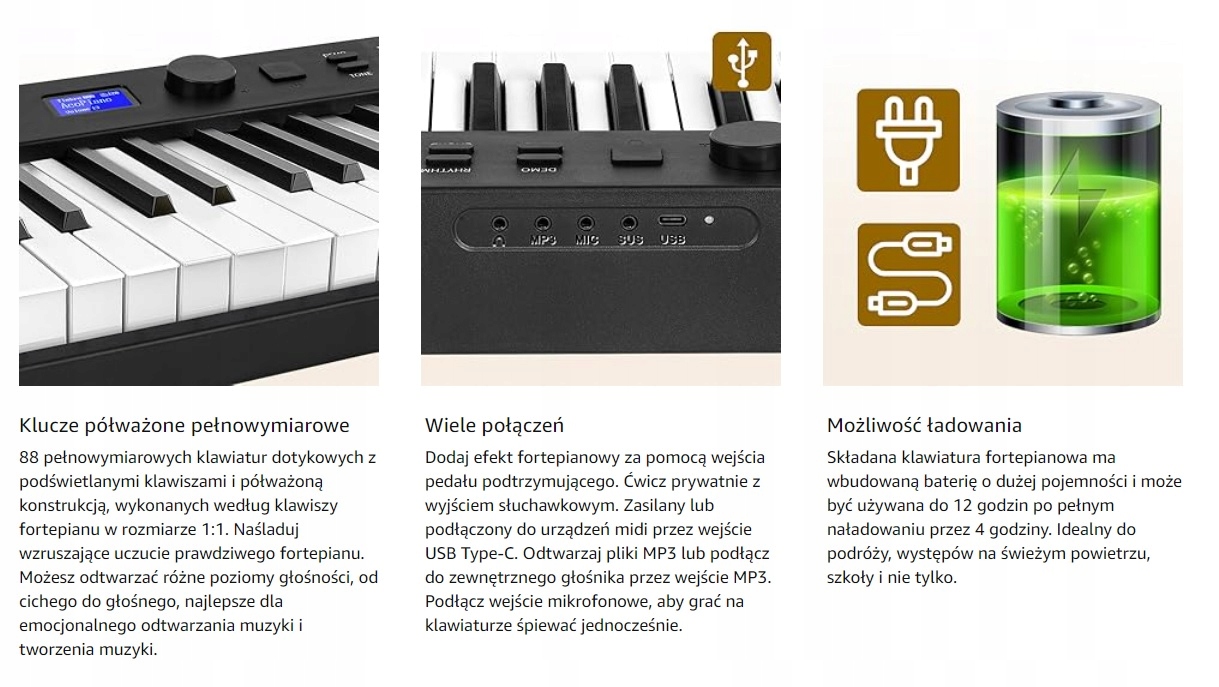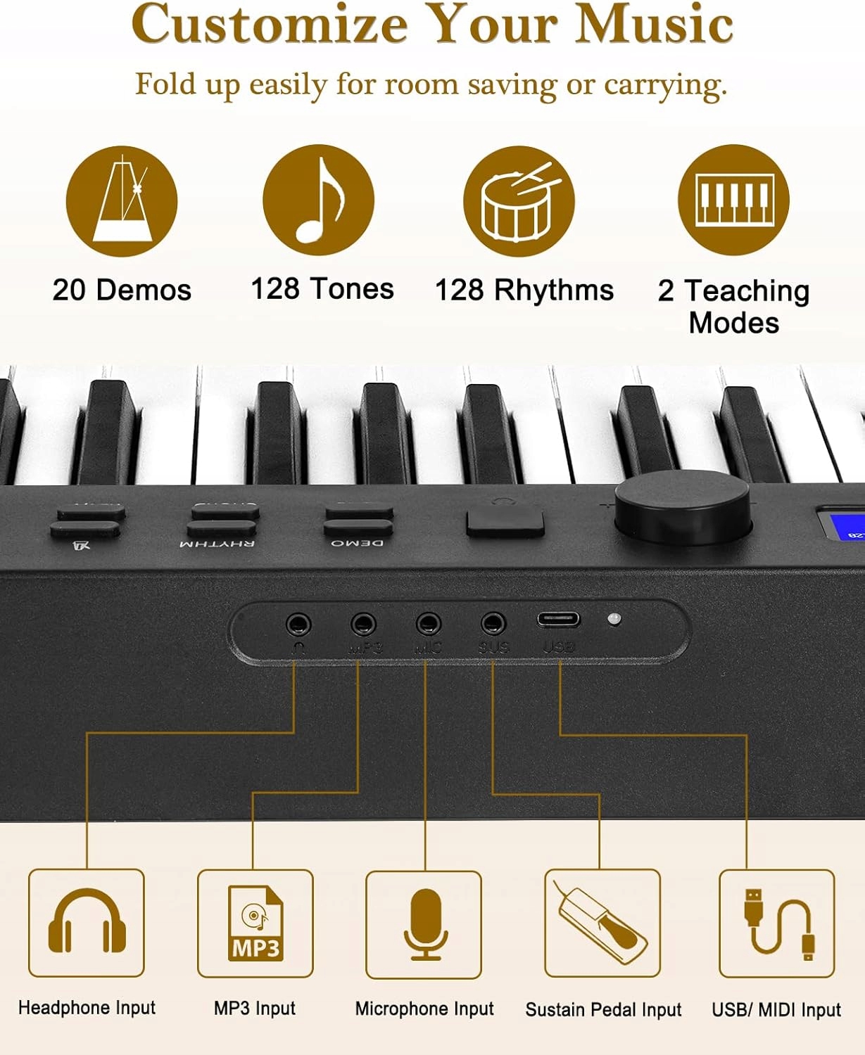 - Легкий і портативний : 88-клавішна складна структура клавіатури піаніно, яку можна скласти навпіл, легка та займає мало місця. Поставляється з сумкою для перенесення, яку легко зберігати та брати з собою на вулицю, ідеально підходить для подорожей. (Розміри після складання становлять 63 см х 20,3 см х 11,9 см, вага нетто лише 4,4 кг)