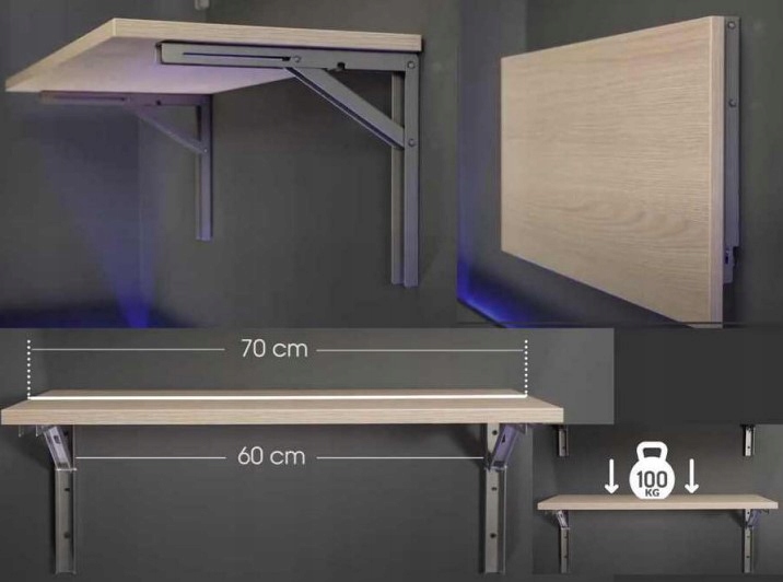 Складний кронштейн дозволяє створити полицю в місцях з обмеженим простором. Його міцний і простий у використанні дизайн дозволяє широко використовувати, наприклад, на маленькій кухні, у коморі, гаражі та скрізь, де вам потрібна полиця, яку за потреби можна скласти чи розкласти одним рухом руки.