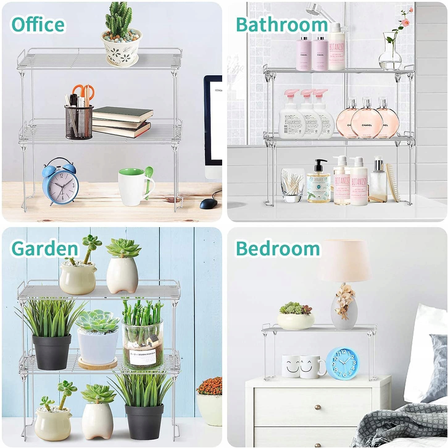 Стійкий і простий у використанні: виготовлений із міцної сталі з хромованим покриттям, висока якість використаних матеріалів гарантує, що ваша шафа-органайзер утримуватиме щоденні тарілки та їжу без складок. Без збірки, без інструментів. Ви можете розмістити ці стелажі в центрі харчової шафи або харчової комори як два рівні зберігання. Ви також можете використовувати цю підставку в шафі під раковиною
