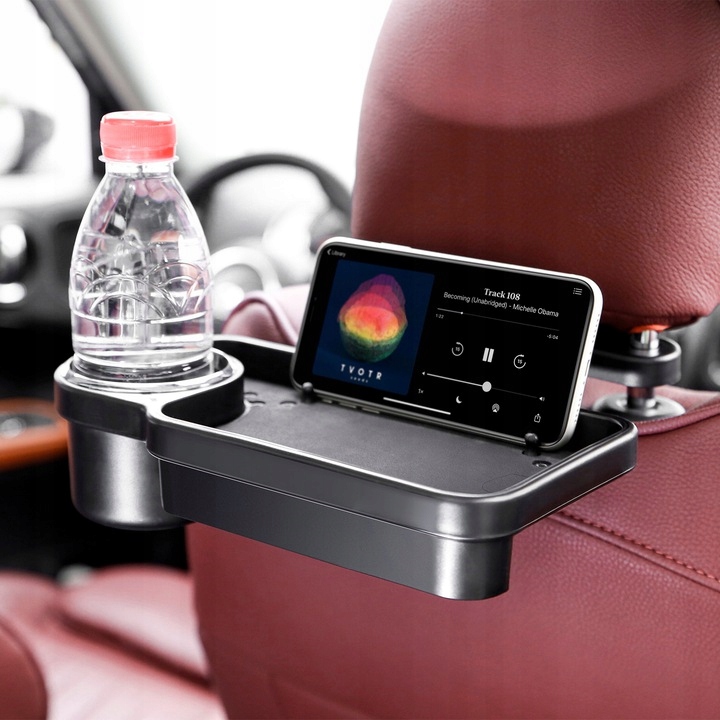 Складна підставка з кріпленням до підголівника сидіння - зручне рішення не тільки під час тривалих поїздок. Підходить для зберігання закусок, напоїв, іграшок та різних дрібниць.