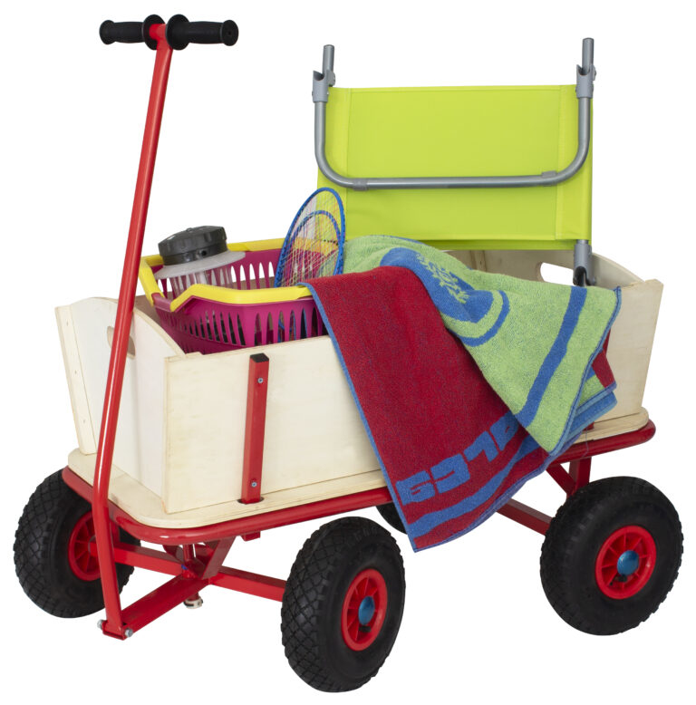 Дерев'яна коляска з товстими колесами, які не застрягають у піску, допоможе в транспортуванні всього цього