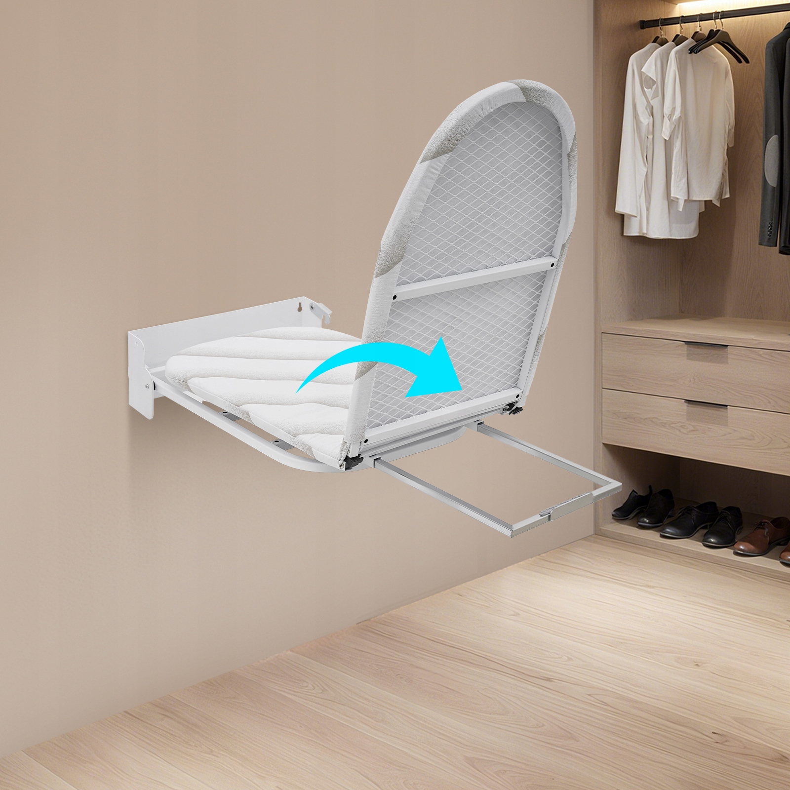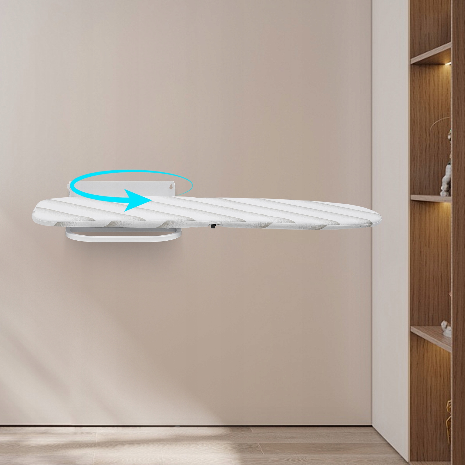 Цю прасувальну дошку було продумано розроблено, щоб її можна було легко встановити на стіну та скласти, коли вона не використовується, що значно економить простір. За потреби її можна швидко розкласти, а її унікальна функція повороту забезпечує користувачам зручність прасування під різними кутами. Ретельно розроблена прасувальна поверхня забезпечує плавний процес прасування, що робить його практичним інструментом у будинках, гуртожитках та інших місцях. З практичної чи естетичної точки зору ця прасувальна дошка є ідеальним вибором.