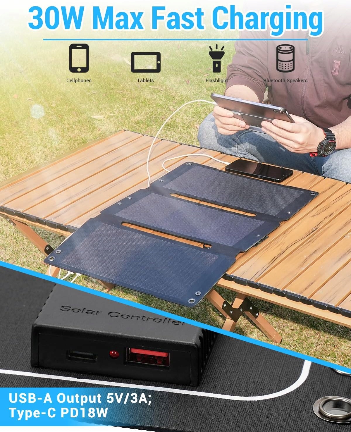 - 【Швидка зарядка 30 Вт МАКС】 Портативна сонячна панель SUPAREE Camping може живити ваші пристрої потужністю до 30 Вт, що забезпечує швидку зарядку навіть на вулиці. Складна сонячна панель SUPAREE має USB-виходи USB-QC3.0 і Type-C, сумісна з більшістю моделей електронних пристроїв і може заряджати два пристрої одночасно.