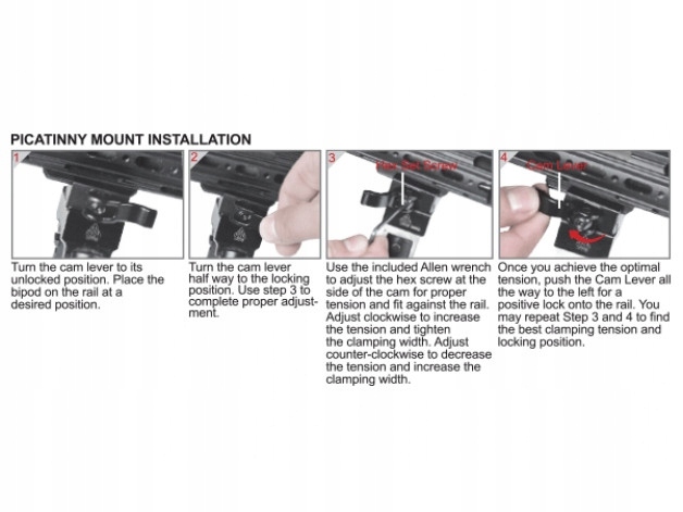 Сошка має посилену металеву конструкцію, стійку до віддачі зброї та складних умов місцевості.Сошку можна встановити на планку Picatinny або Weaver, а за допомогою адаптера, що входить до комплекту, також на гвинтівки, оснащені традиційний верх. Завдяки важелю QD, що замикається (швидке від'єднання), встановлення основи на рейку займає лише кілька секунд.