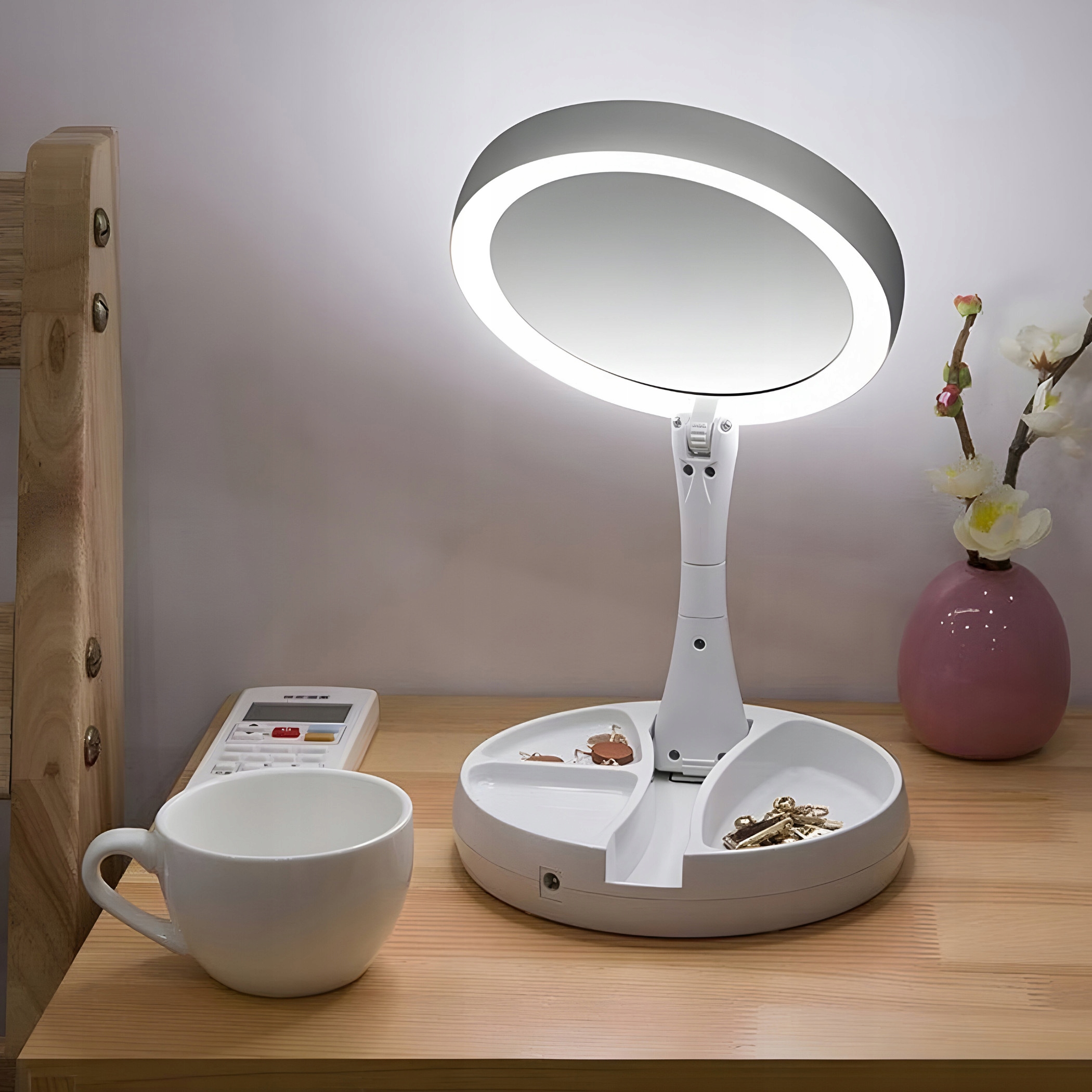 Настільне дзеркало з відділеннями в основі — це практичне рішення, яке дозволяє організувати основні косметичні приналежності. Можливість легко складати і розкладати робить його зручним і мобільним виробом. Він живиться від батарей і акумулятора, який заряджається через USB, тому він не залежить від джерел живлення.
