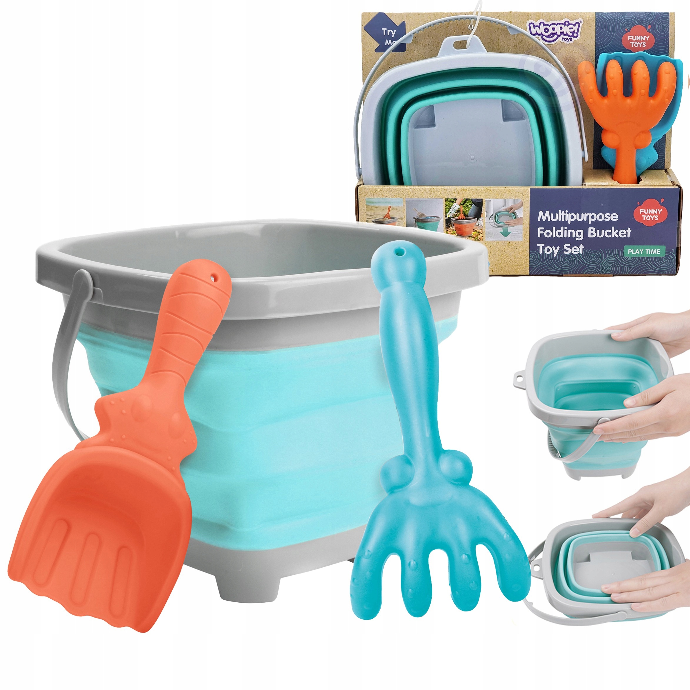 Силіконове відро з граблями та лопатою від бренду WOOPIE. Чудове відерце для пісочниці, пляжу або саду, завдяки якому дітям буде приємно проводити час на свіжому повітрі Відерце, завдяки своїй складній конструкції,< b > займає мало місця, легко транспортується і зручно зберігати.Набір поміститься в дитячий рюкзак, коляску або пляжну сумку.
