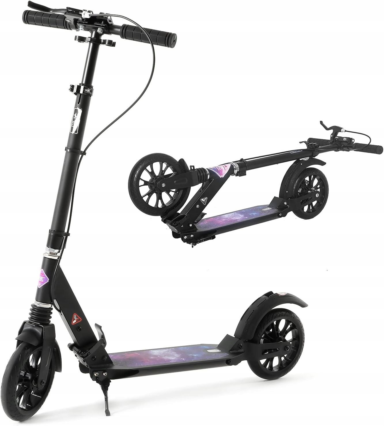 hulajnog з транспортним механізмом, легко скласти за 3 секунди для швидкого зберігання та транспорту. Вони зменшують вібрації на дорогах, забезпечуючи спокійну їзду. Ідеально підходить для міських / приміських доріжок. Регульоване Т-подібне рульове колесо: кермо з зручними гумовими ручками та діапазоном коригування висоти в 3 рівнях, 90-105 см, придатним для дорослих, підлітків та дітей віком від 12 років або для людей з висотою 145-185 см.