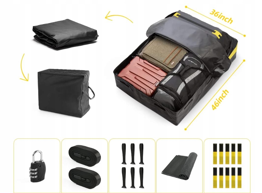 Повний комплект готовий до подорожі! Наш багажник на даху не лише забезпечує простір, але також містить килимок проти ковзання, міцний замок та інші аксесуари, які зроблять вашу подорож ще комфортнішою та безпечнішою.