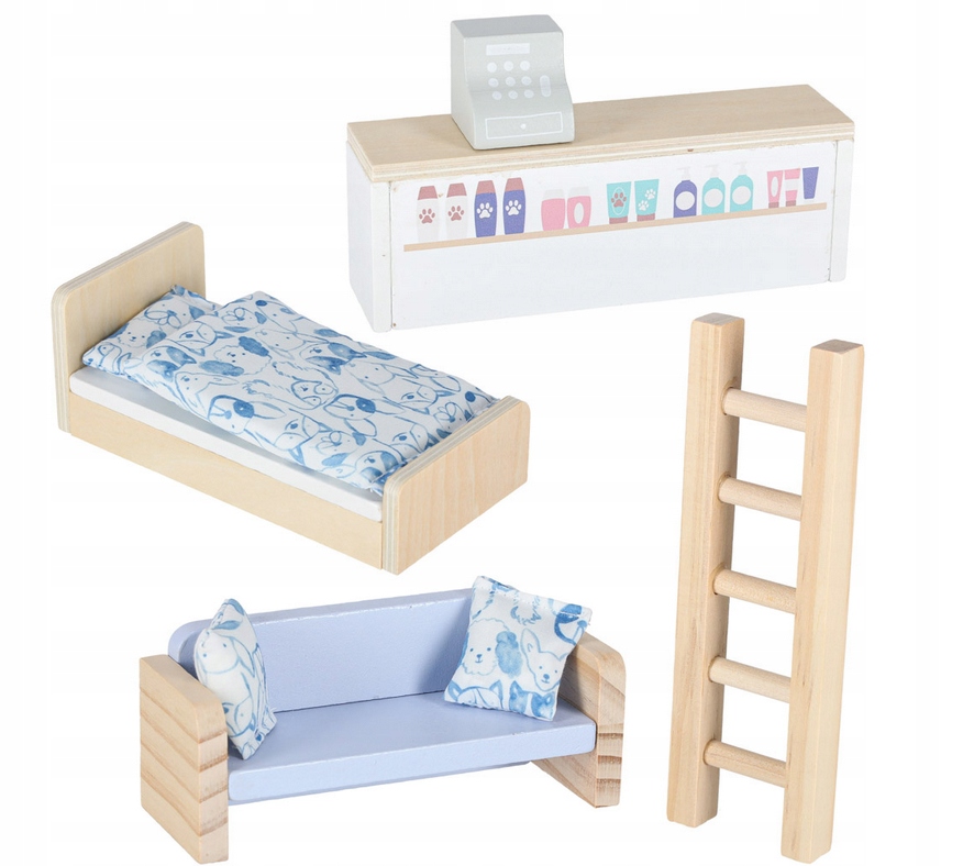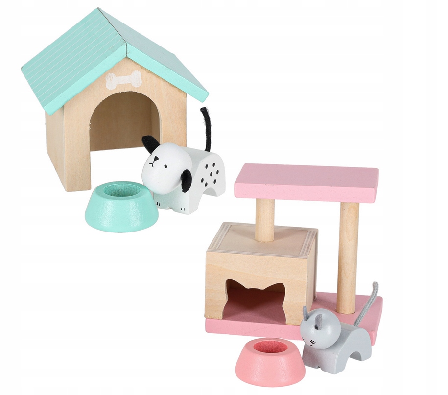 Багате обладнання - набір включає фігурки собаки та кота, будку, когтеточку, стійку з касою та набір дерев'яних меблів.