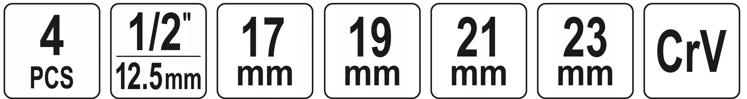 - хромовані розетки розміром 17 мм, 19 мм, 21 мм, 23 мм