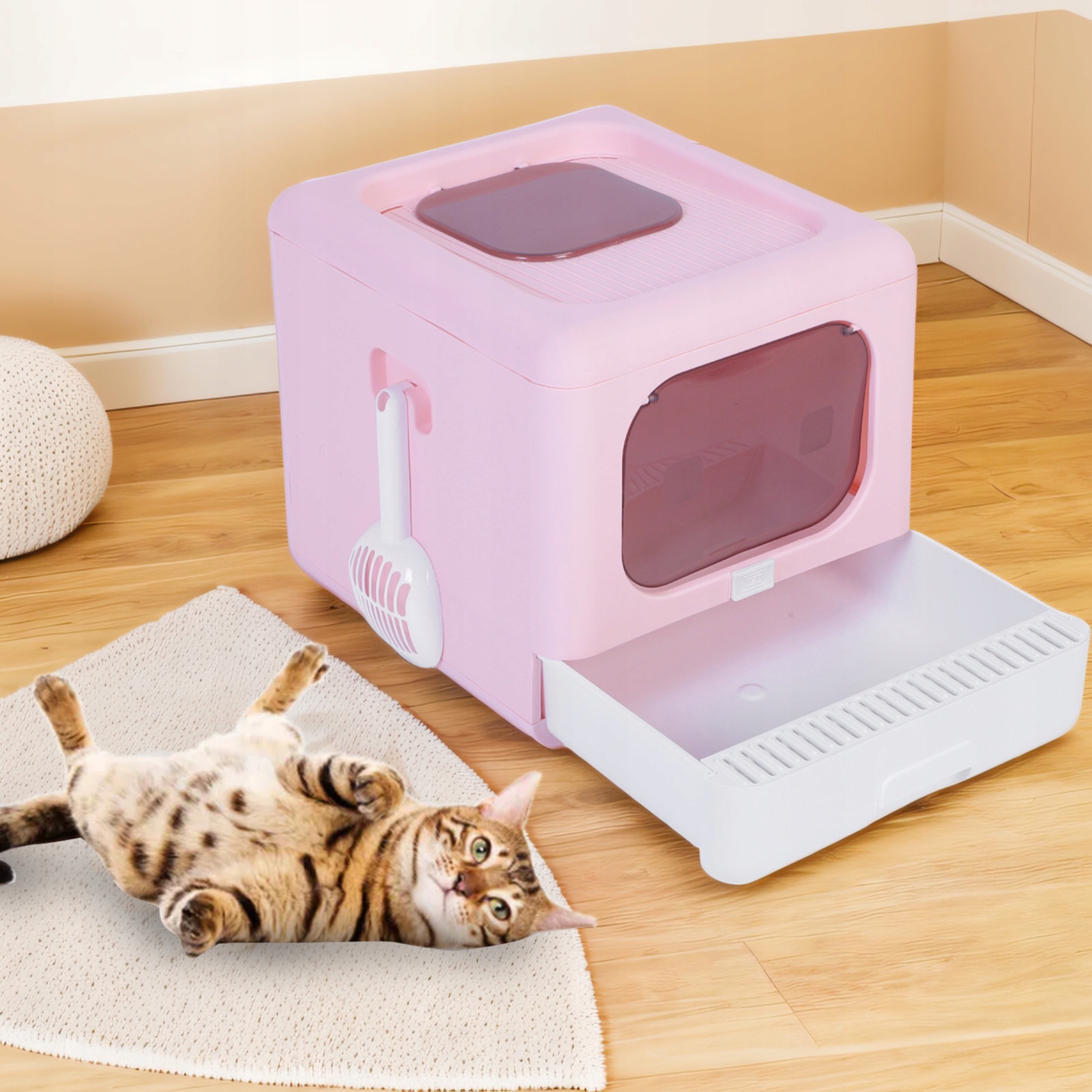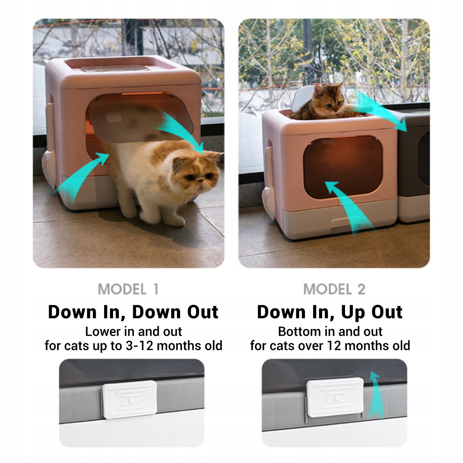 2. Ефективний контроль запаху: закрита конструкція котячого туалету ефективно захоплює запахи, заважаючи їм поширюватись по всьому будинку. Ця функція не тільки підтримує свіже та чисте середовище, але й гарантує, що ваш житловий простір залишається без запаху, усуваючи необхідність постійного обслуговування та освіжувачів повітря.