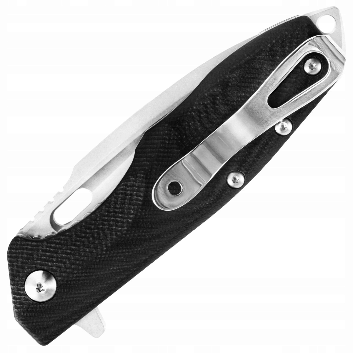 Накладки з склоепоксидного композиту G10 прикручуються до сталевих вкладишів. Сталева кліпса полегшує щоденне носіння. На кінці рукоятки є отвір для страхувальної мотузки та розбивача скла.