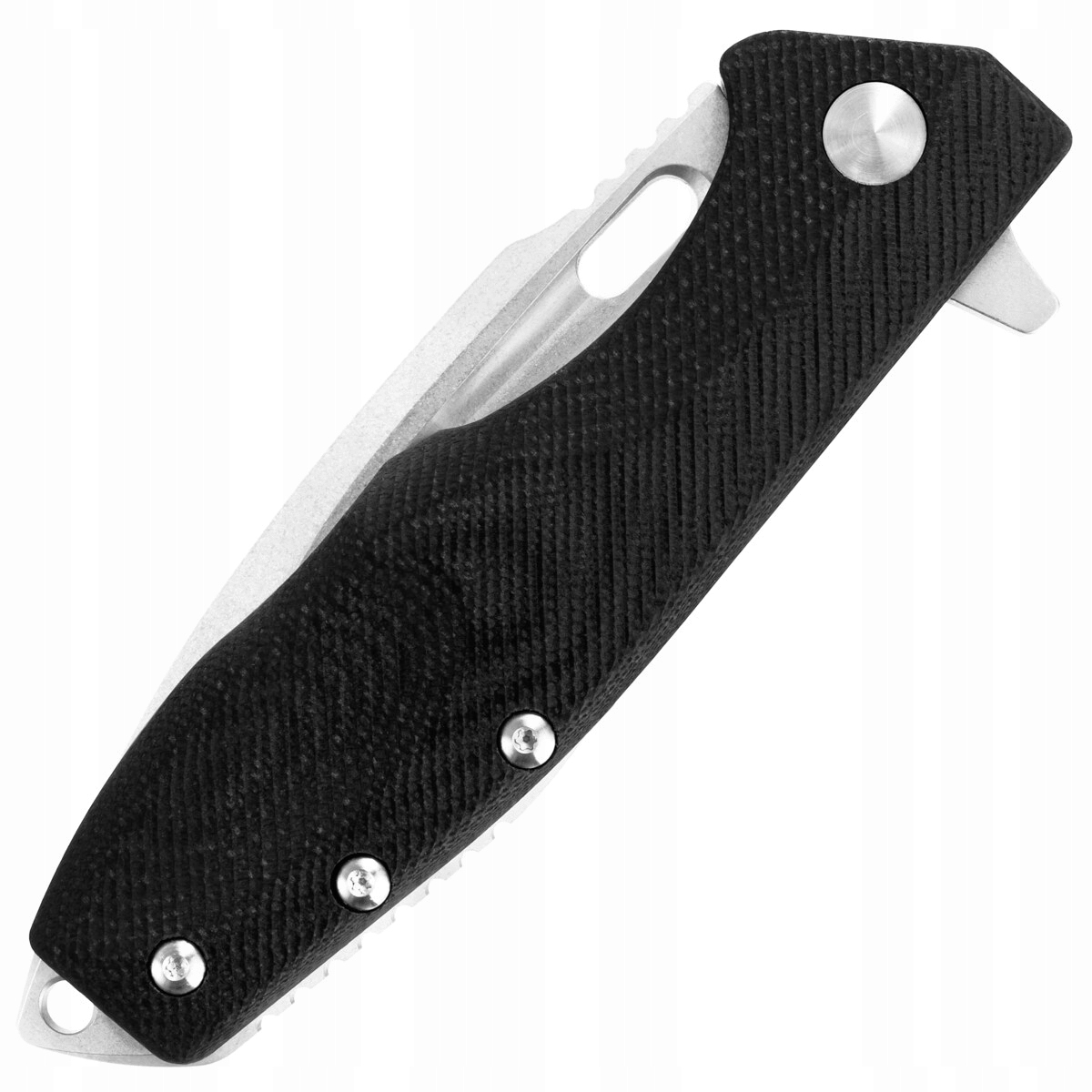 EDC типу Boker. Лезо виготовлено зі сталі D2 з високою агресивністю різання та високою стійкістю до стирання та оздоблено каменем. Отвір у лезі та фліппер полегшують відкриття ножа. У розкритому стані згаданий ласт служить невеликою ручкою. Крім того, ніж має підшипники, що забезпечує плавну роботу. Замок liner-lock характеризується високою міцністю та стабільністю.