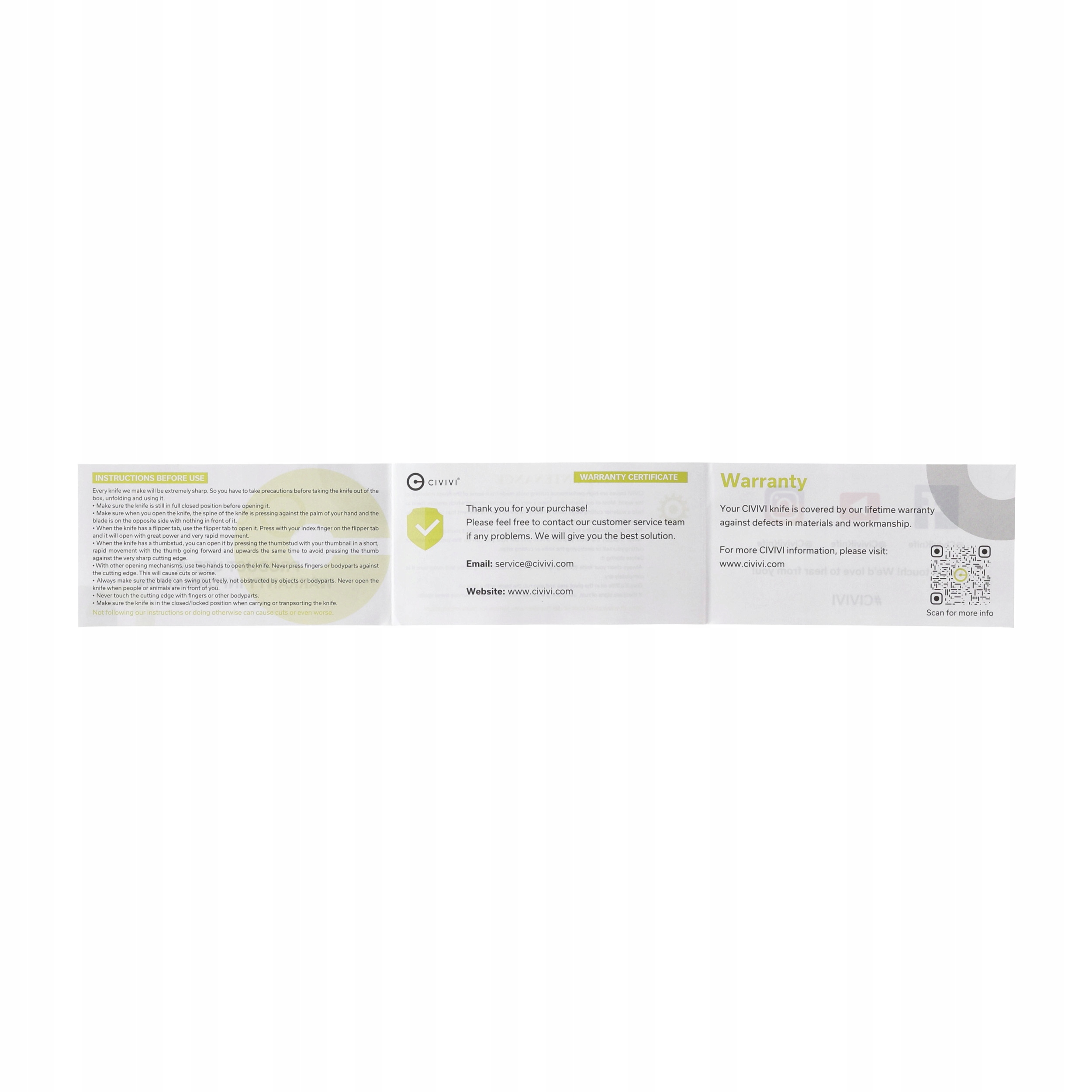 Рукоятка ножа виготовлена з алюмінію та має ромбовий малюнок. Конструкція з відкритою спинкою та розпірними рукавами зменшила вагу та спростила прибирання. Вісь леза прикрашена логотипом Civivi, а односторонній затиск Deep-carry дозволяє непомітно носити ніж у піднятому положенні.