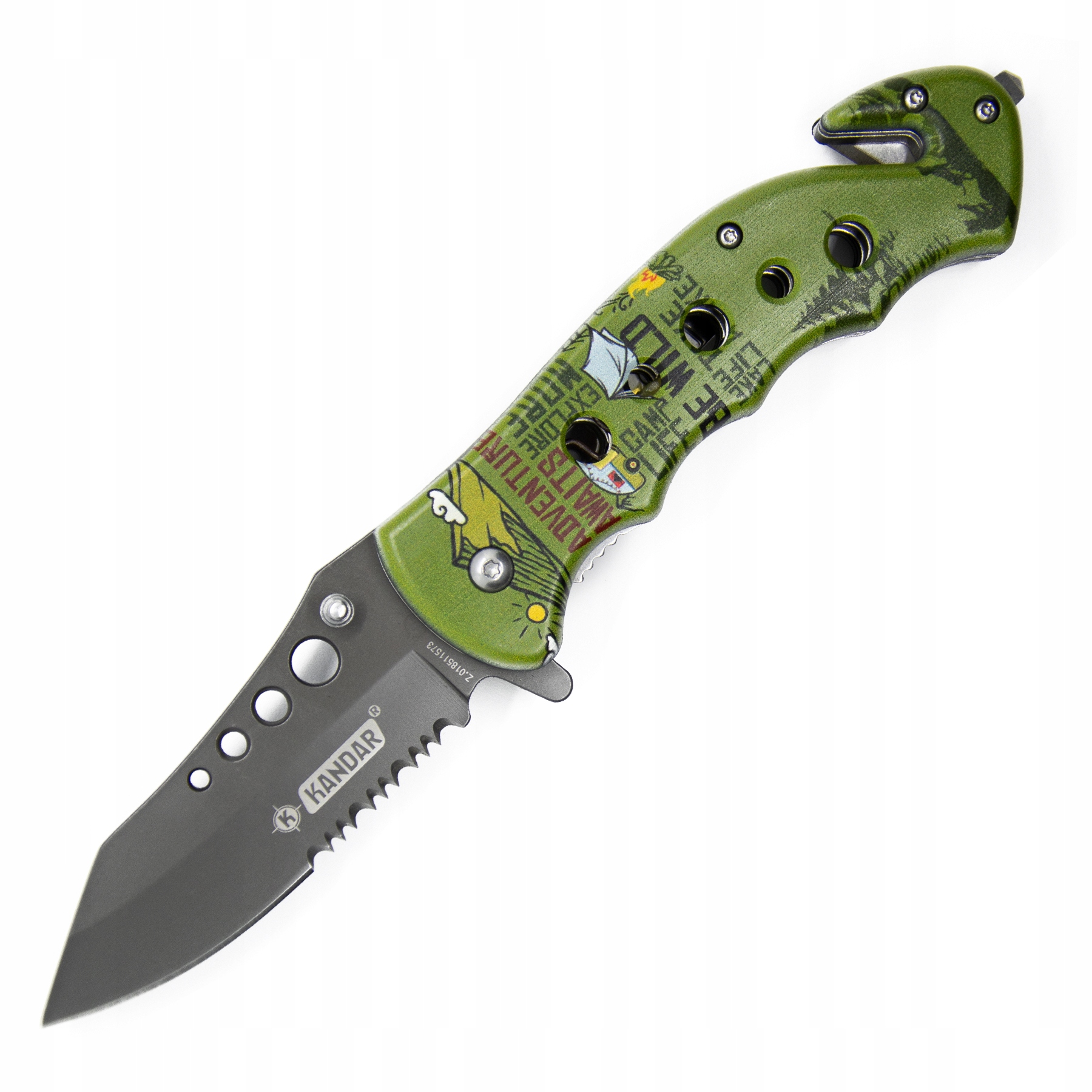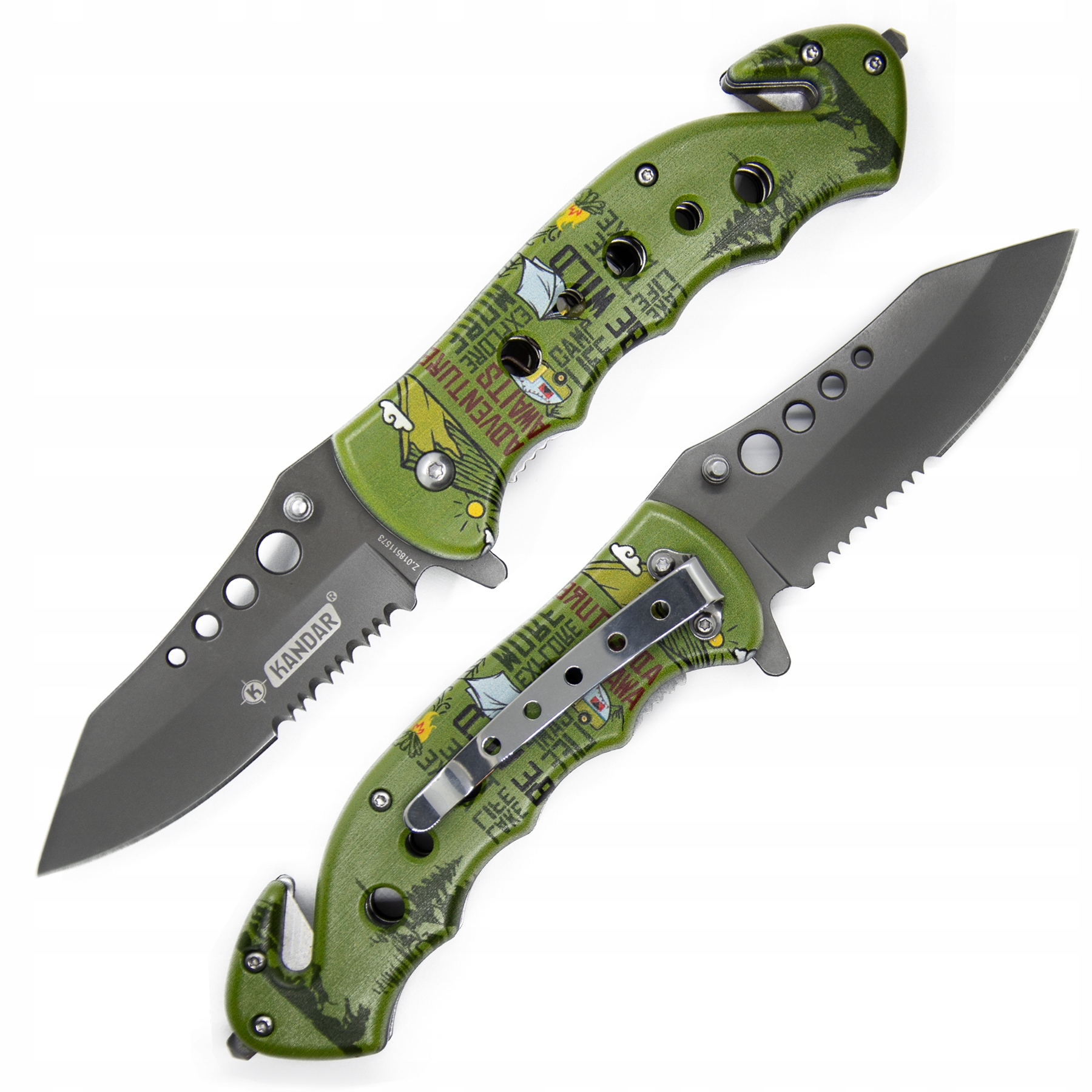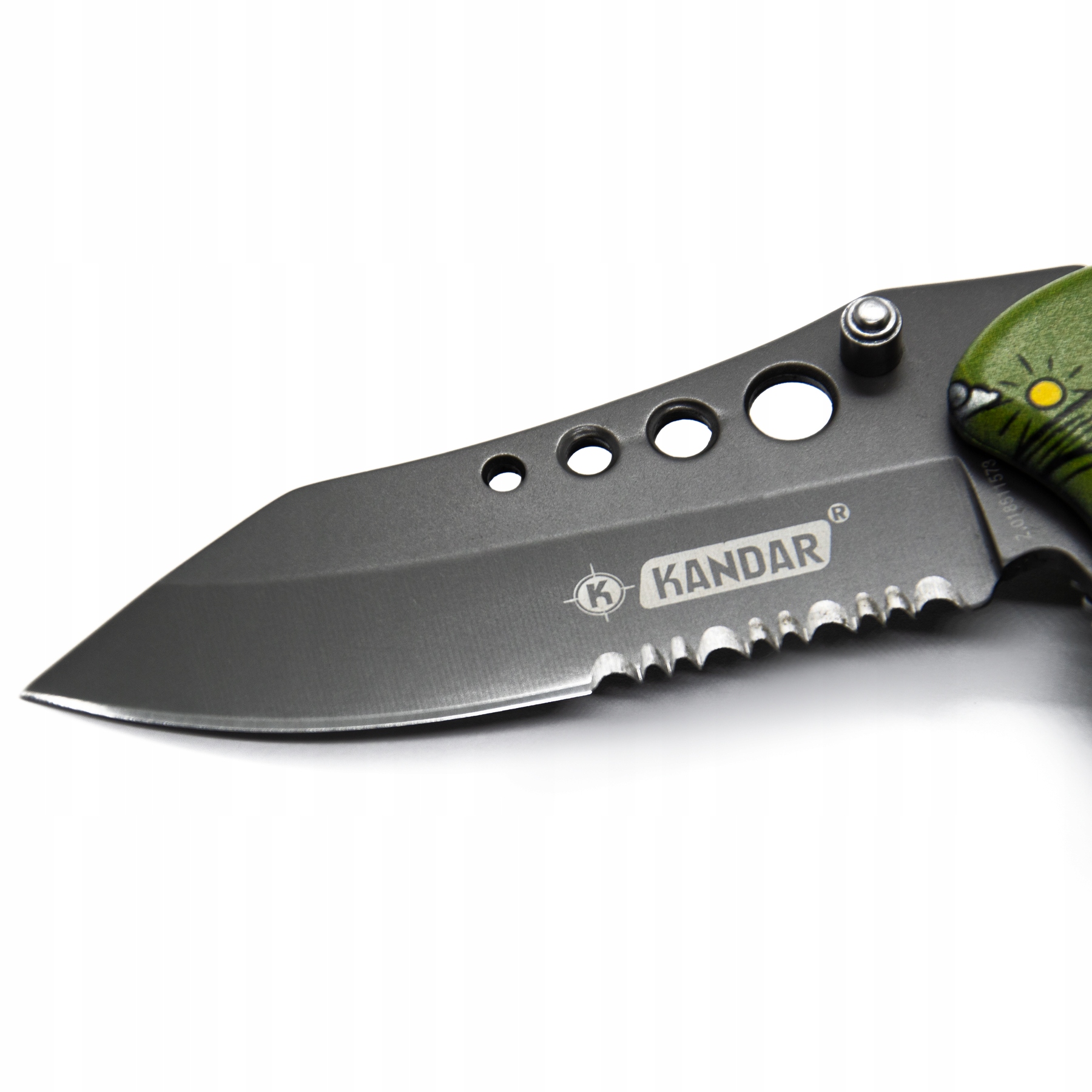 Клинок складного туристичного ножа Kandar Adventure Awaits має зубчастий пилкоподібний елемент і спеціальні отвори, що впливають на ергономічність різання. На тильній стороні руків'я є спеціальний різець для ременів і мотузок. ., а при транспортуванні ножа кліпса незамінна, оскільки дозволяє зручно закріпити виріб у кишені брюк, системі кріплення MOLLE або брючному поясі.