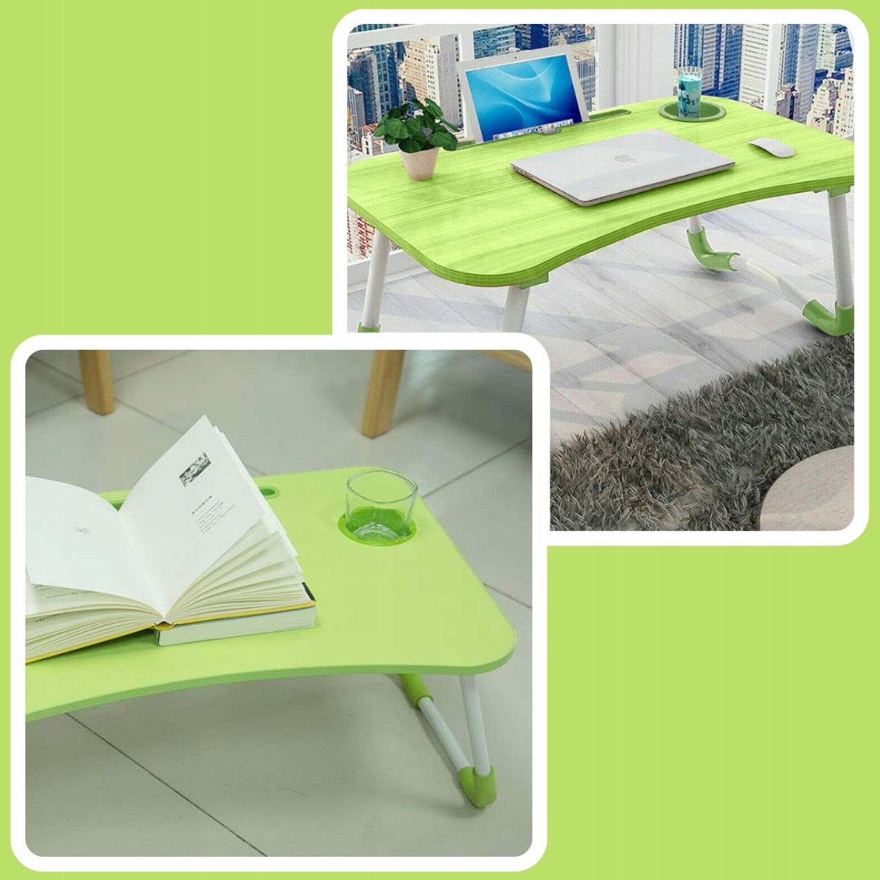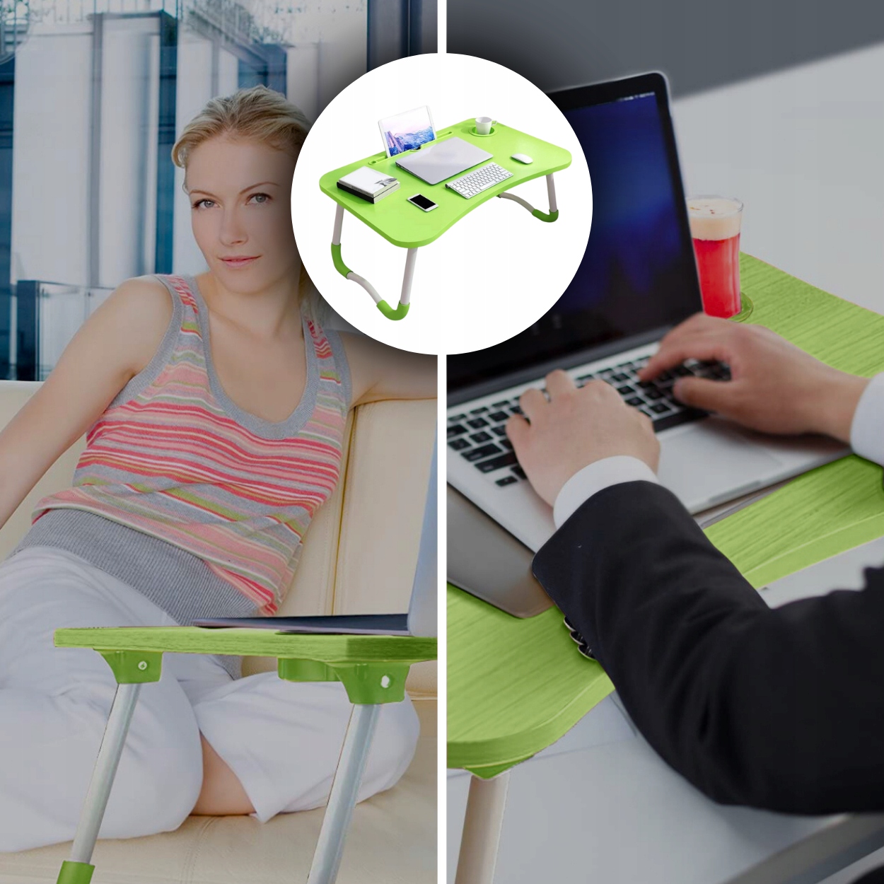 Ідеально підходить для роботи та ігор вдома або під час подорожі. Це дозволяє комфортно використовувати ноутбук або інший пристрій практично в будь-яких умовах. У складеному вигляді займає мало місця, його можна легко сховати, наприклад, під ліжком і завжди мати під рукою. Оснащена профільованим виїмкою для планшета або телефону та отвором для чашки. Ви також можете перетягнути зарядний пристрій і зарядити ці пристрої під час їх використання. М'який нековзкий захист для ніжок підвищує стійкість і захищає стіл.