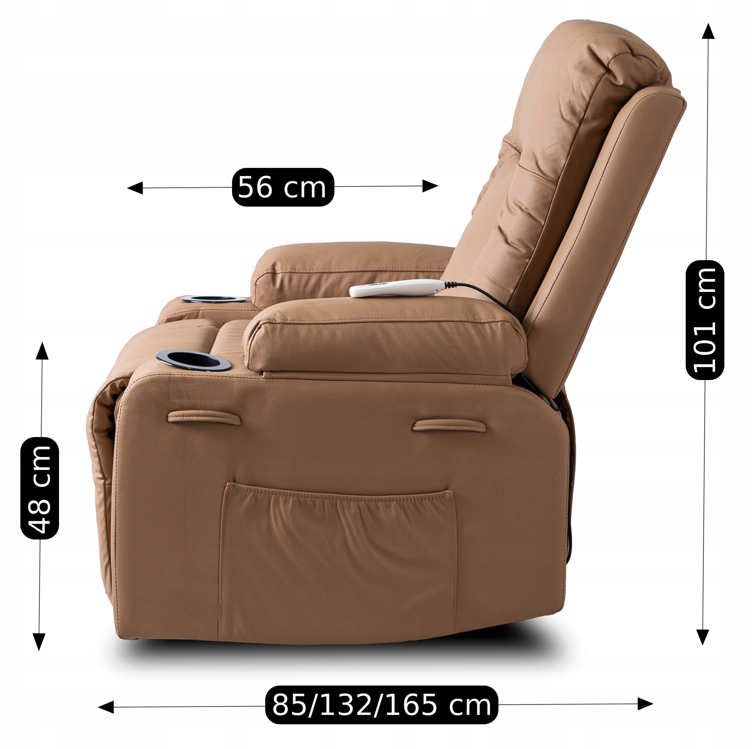 ✨ крісло для коробки - це ідеальне поєднання сучасного дизайну з комфортом. Це розгортається на взаємне положення і має контрольовану пілотну функцію масажу . Він має товстий шар оббивної піни, тому вона м’яка і сидить або лежить в ньому справді комфортно. Крісло покрите високоякісною екологічною шкірою в карамельному кольорі, що додає елегантності.
