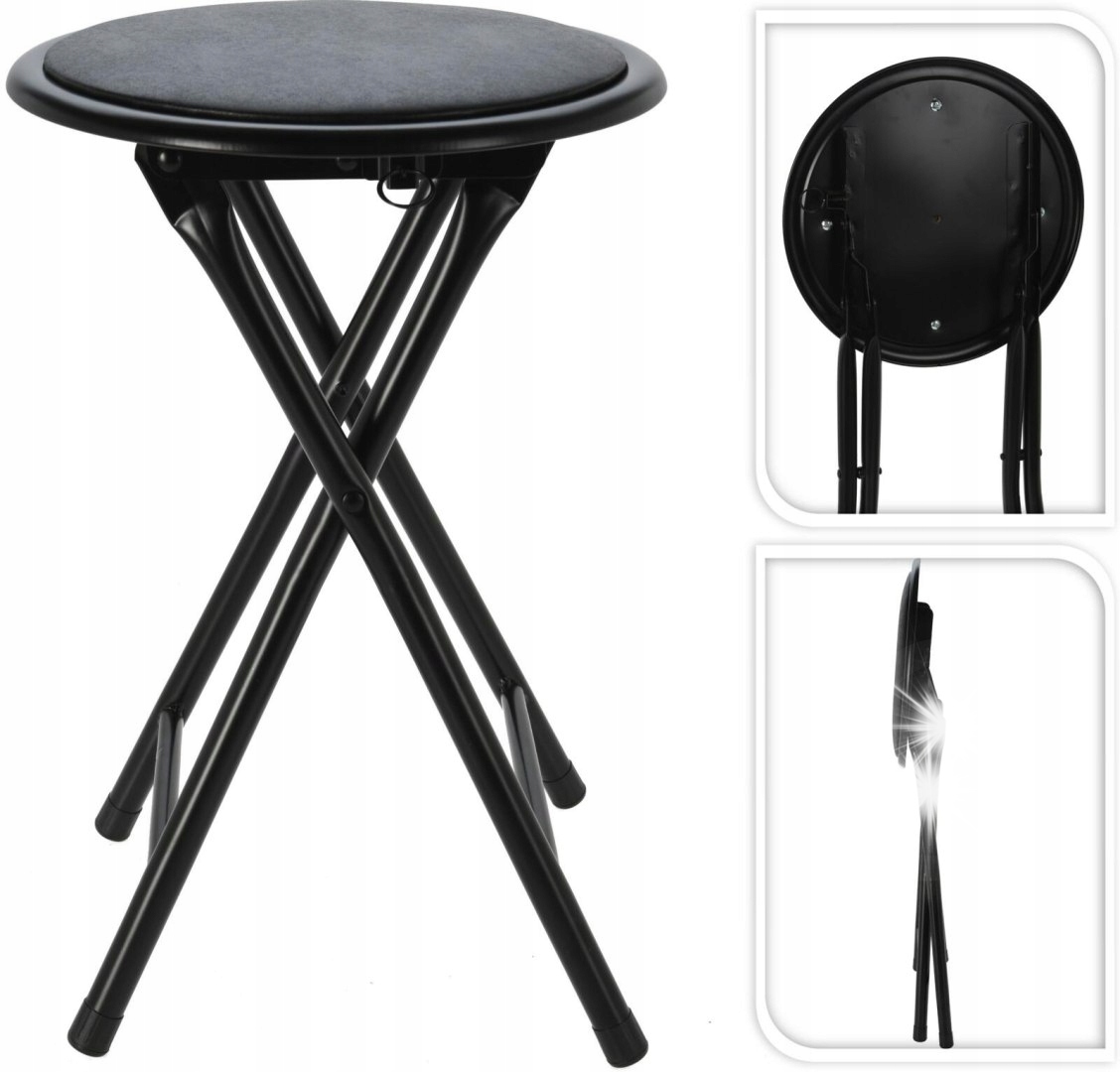 Складний табурет у чорному t Ідеальне додаткове сидіння в невеликій квартирі або студії. Ми можемо використовувати круговий табурет під час сніданку, і коли нам потрібно більше місця на кухні чи їдальні, ми можемо скласти табурет. Сидіння з еко -шкіри та металевих з'єднань. Основа стільця - метал. Розміри коробки: 30x6x71cm
