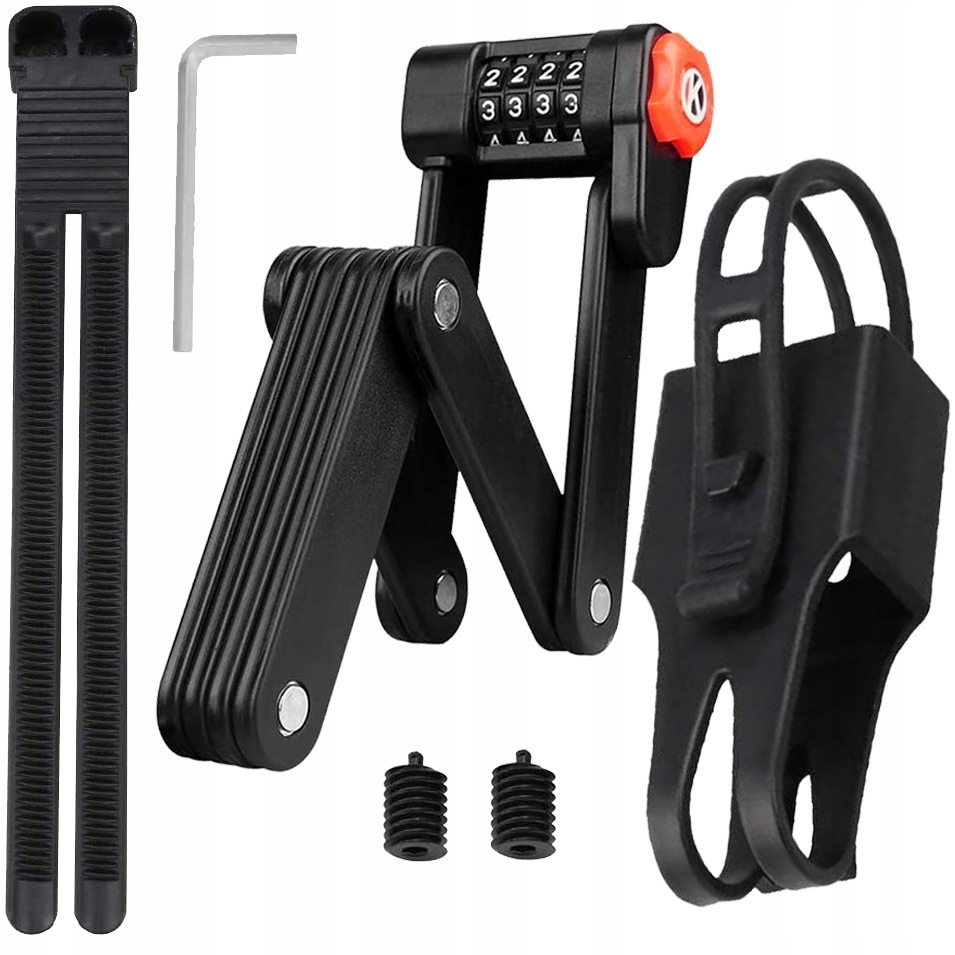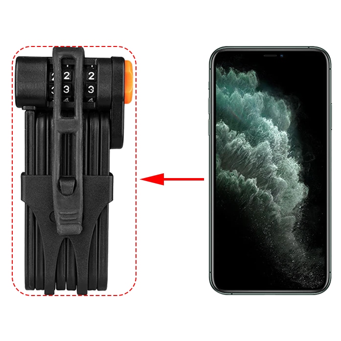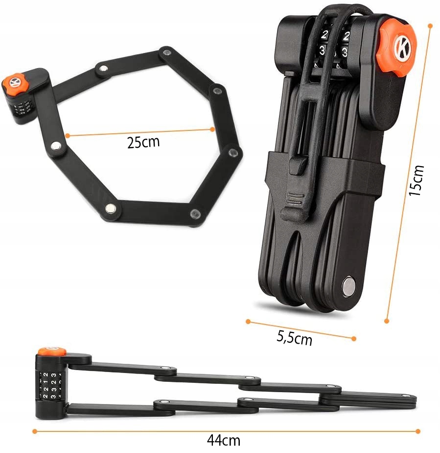 Замок з високоякісних матеріалів. Ланки ланцюга з'єднані міцними заклепками. Охорона має кодовий замок, що більш зручно у використанні. Вам більше не потрібно пам’ятати свої ключі, щоб ним скористатися. У складеному вигляді він займає дуже мало місця, тому ви можете легко встановити його на велосипед і транспортувати.