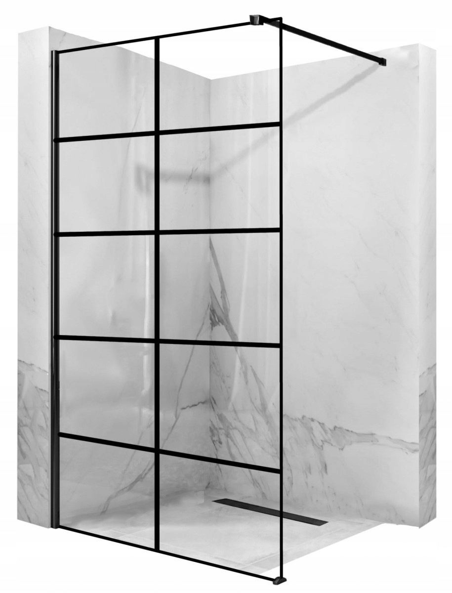Виготовлений з високоякісного алюмінію чорного кольору (стінний профіль + підлогова планка) і, що дуже важливо, зі скла товщиною 8 мм, завдяки якому скло є стійким і простим в установці, а також додаткової монтажної рами, яка входить в комплект. робить душову стіну дуже міцною .