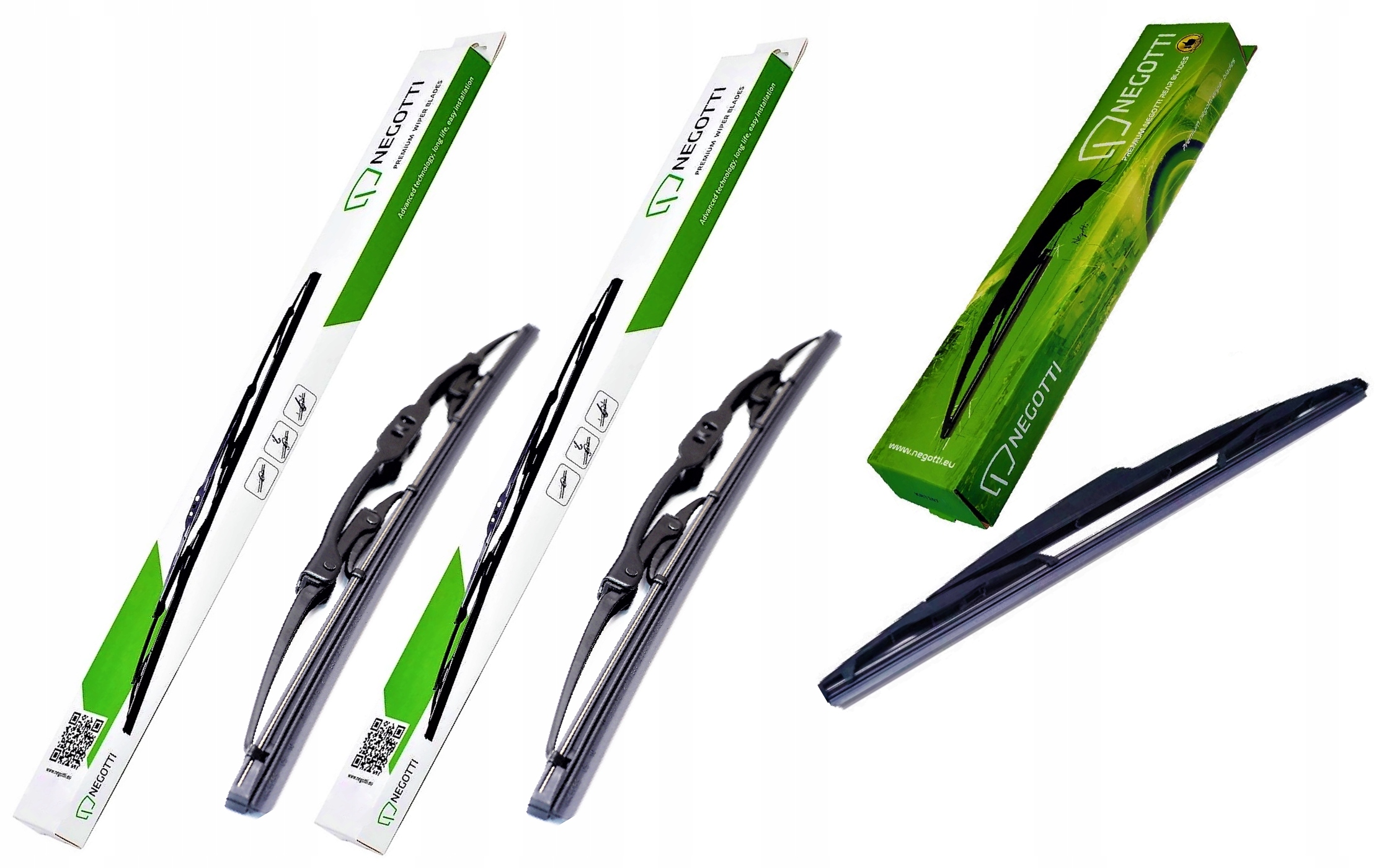 Скелетні щітки склоочисника Negotti. У набір входить набір спеціальних автомобільних склоочисників (3 шт., передній лівий і правий + задні) з кріпленням для заводських важіль.