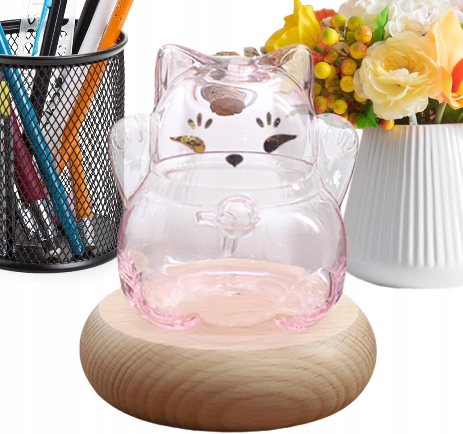 Ця скляна скарбничка, створена у формі чудового кота, поєднує функціональність з естетикою. Його невеликий розмір і портативність гарантують, що він впишеться в будь-яку обстановку, будь то на туалетному столику, книжковій полиці, підставці, столі, біля ліжка або тумбочці. Прозорий корпус елегантно представляє ваші золоті зерна, зірки мрії або сувенірні монети, створюючи візуально приємний ефект.