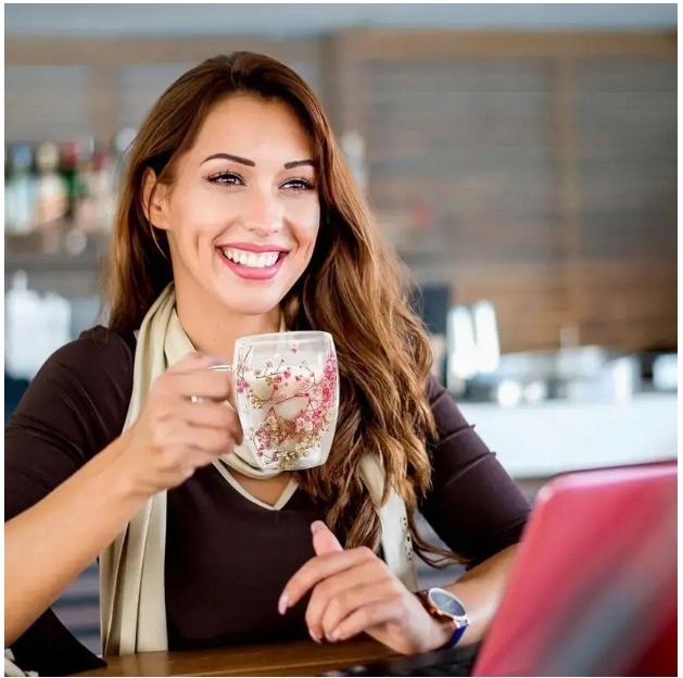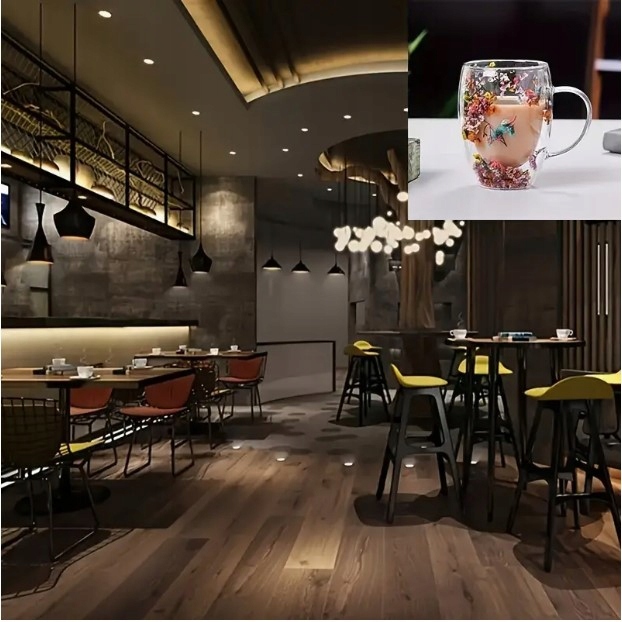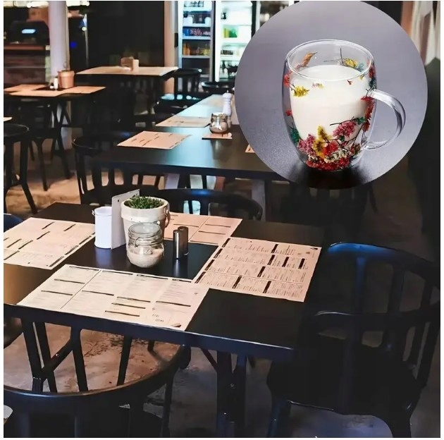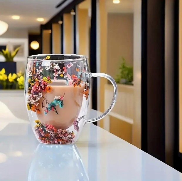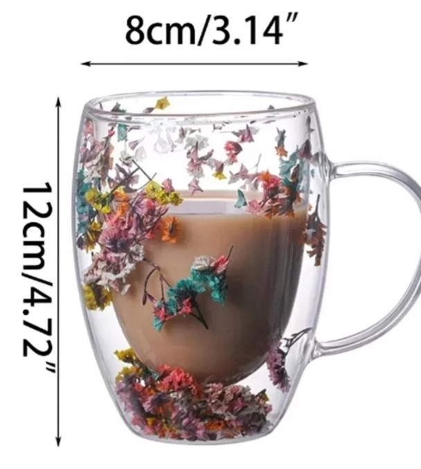 Елегантна та сучасна чашка кави з подвійними стінами наповнена барвистими висушеними квітами, що надає йому унікального персонажа. Високоякісне боросилічне скло підходить для подачі як гарячих, так і холодних напоїв. Однак його ізоляція подвійної сталі підтримує не тільки ідеальну температуру напою, але й захищає руки від гарячого напою.