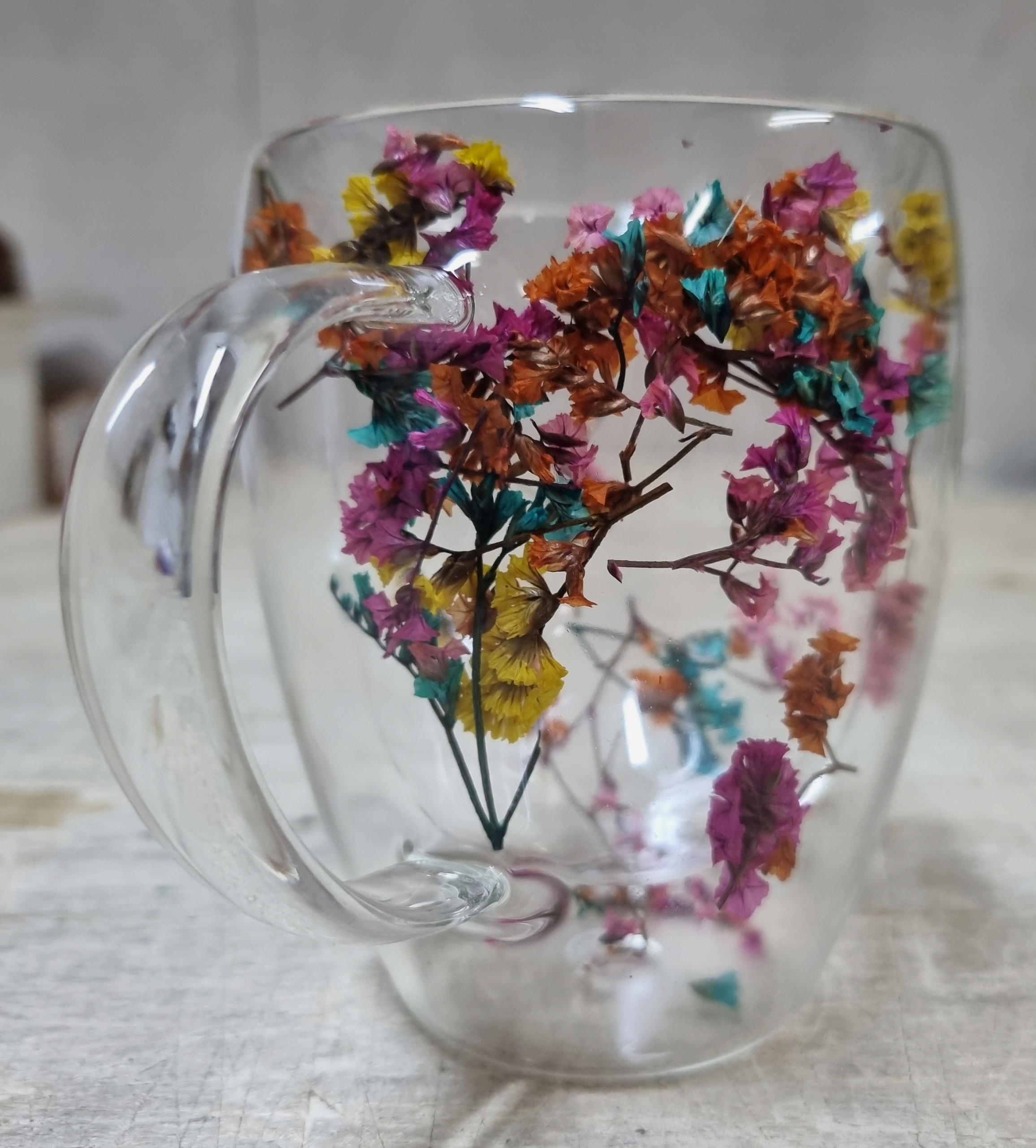 Скляна чашка для подвійного дна з сушеними рожево-синіми квітами
