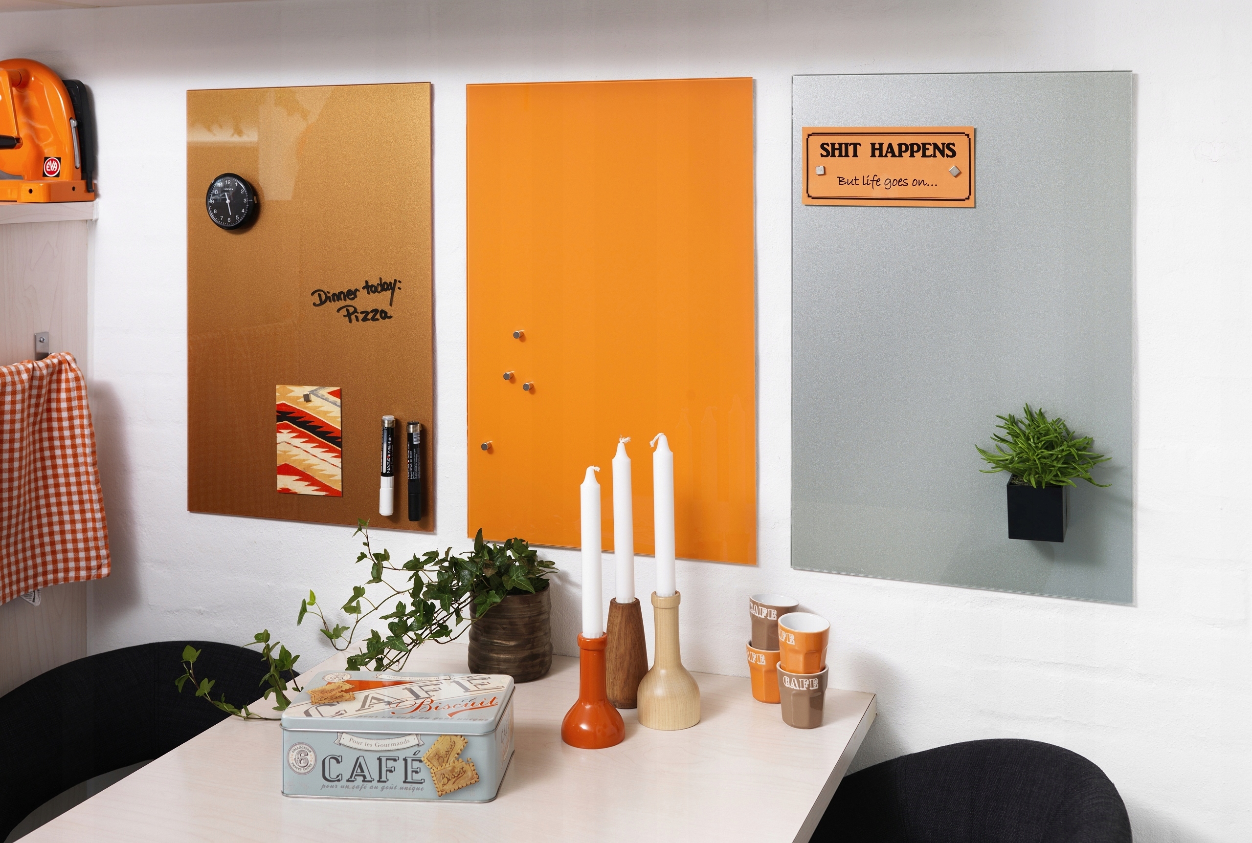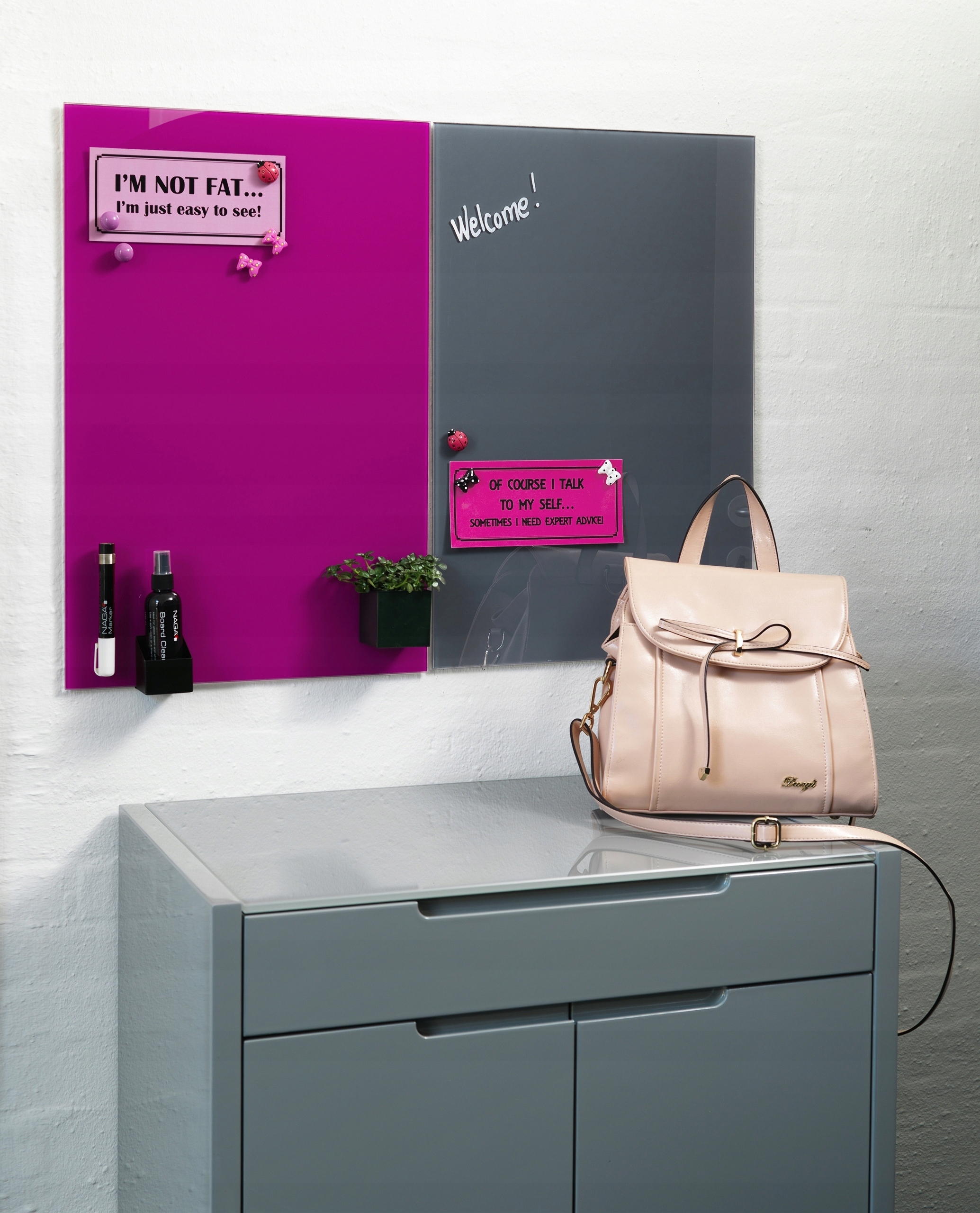 Для дошки потрібні спеціальні сильні магніти, ми особливо рекомендуємо магніти тієї ж компанії (доступні на інших аукціонах). На дошці можна використовувати звичайні та крейдові маркери.