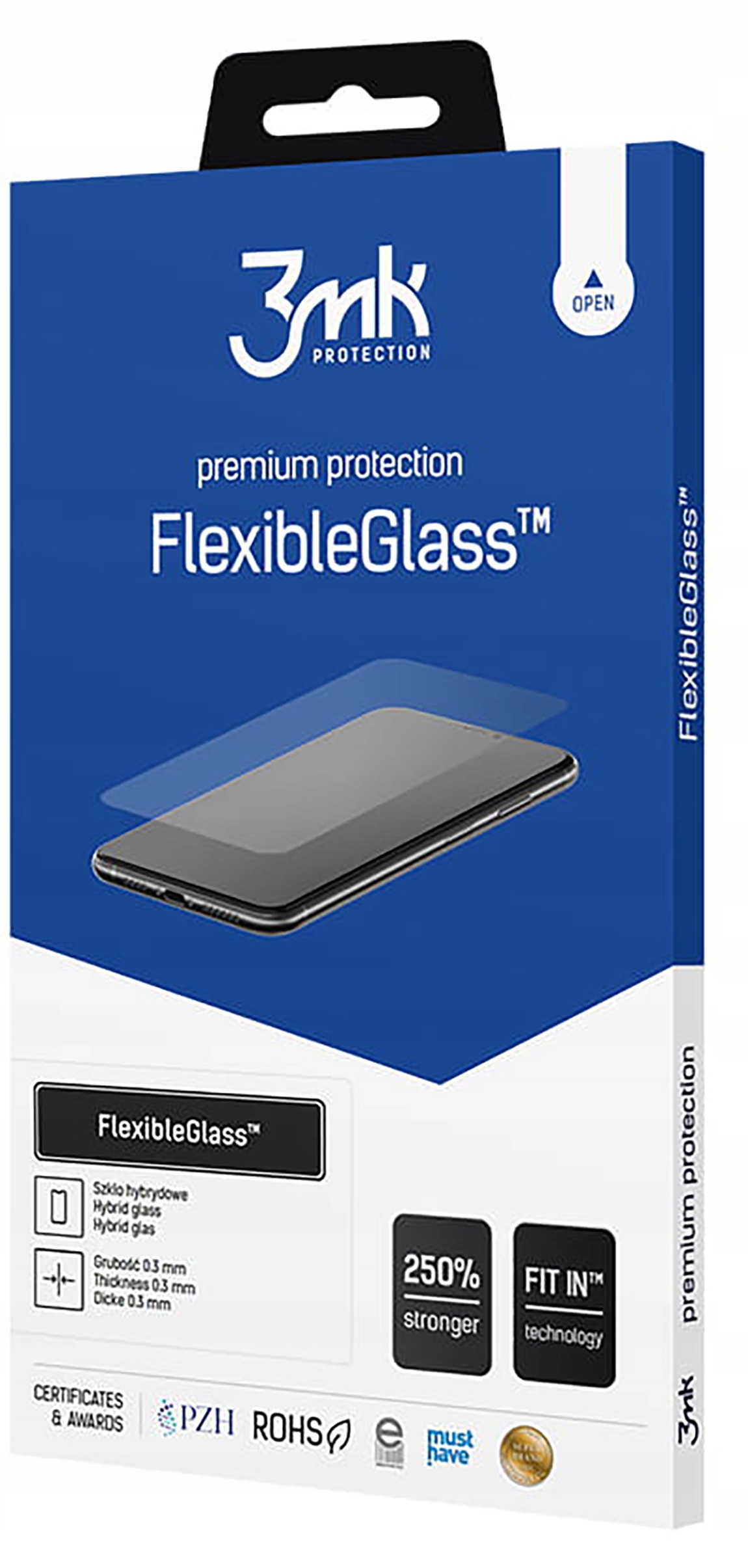 3mk Flexible Glass, тобто гнучке захисне покриття. У порівнянні з іншими продуктами 3mk, Flexible Glass відрізняється найвищою стійкістю до подряпин, яка становить справжні 7H. Гібридна технологія поєднала в собі властивості скла та захисної плівки, що сприяло відмінному захисту дисплея. Гнучке захисне скло товщиною 0,3 мм. Fexible Glass - це безпечне гнучке скло нового покоління, яке завдяки використанню керамічних покриттів створює враження відсутності додаткового захисного шару на дисплеї. Набір містить наклейки для позиціонування Fit-In, які допомагають ідеально наклеїти скло.