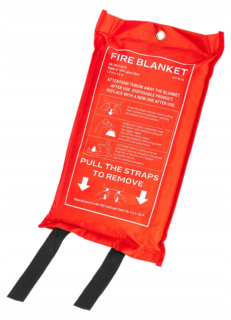 Скляна протипожежна ковдра 1,2 х 1,8 м 97-674 фірми NEO виготовлена зі 100% скловолокна. Його розміри 1,2 х 1,8 м. Упакований в червоний чохол з отвором для підвішування на стіні, він завжди готовий до використання. Не пропускає жир або масло, що істотно знижує ризик повторного займання. Має стійкість до 500 °C. Він відповідає стандарту EN-1869:2019. Незамінний у разі невеликих пожеж вдома чи на робочому місці.