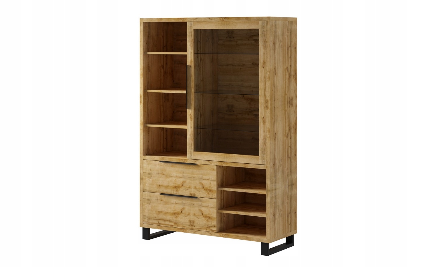 Модний колір дуб Вотан і чорні металеві ніжки, вони надають характеру всьому аранжуванню. Міцна конструкція забезпечує довгострокову гарантію довговічності пропозиції. Функціональні та сучасні меблі варті уваги вимогливих людей. Вони надають інтер’єру розкоші та надають простору виразного характеру. Завдяки такій обробці вітальня стає одночасно сучасною і затишною. Усі форми візуально привабливі та водночас функціональні та дозволяють ефектно демонструвати дрібнички та сувеніри.