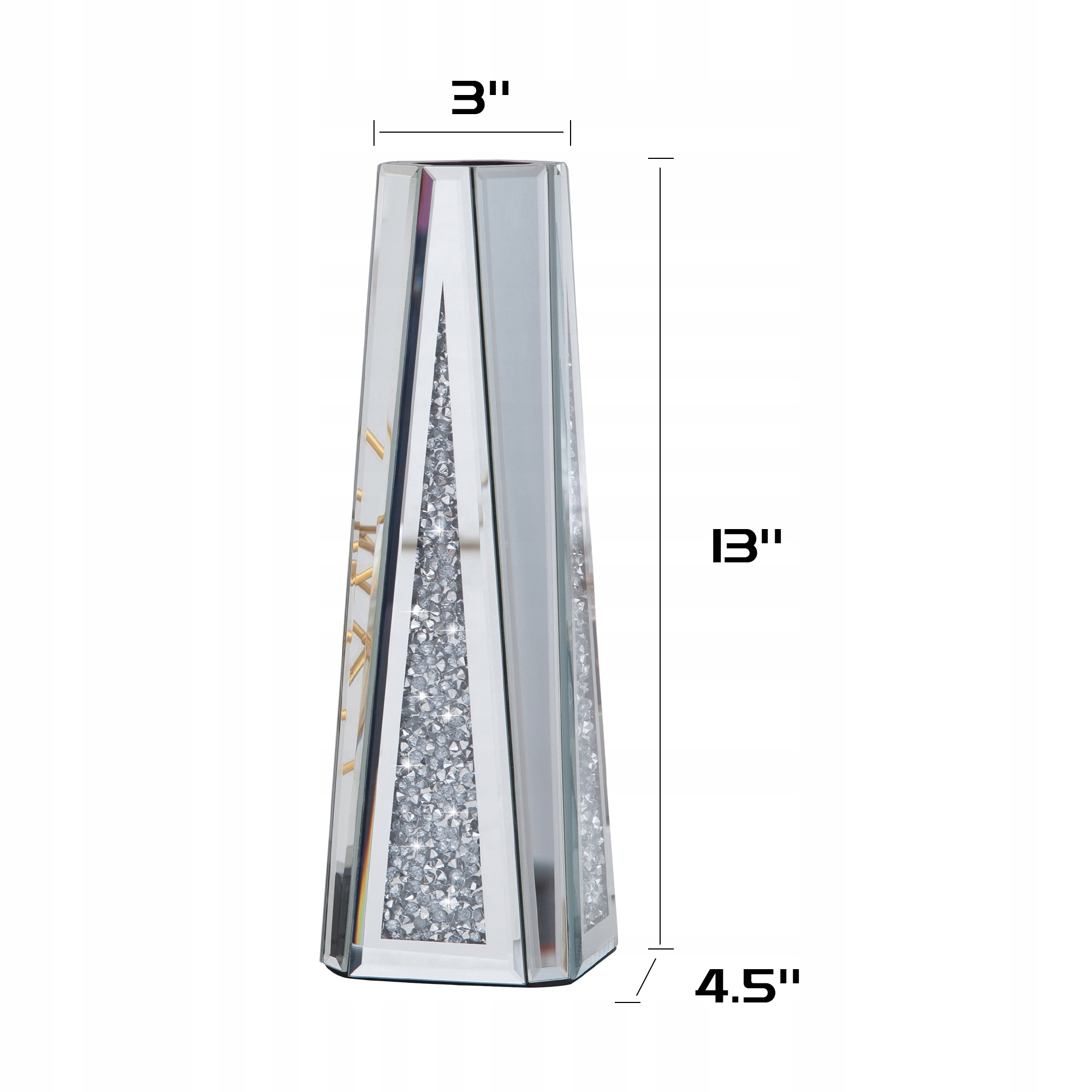 Розміри діамантової вази: довжина 4,5 дюйма. x 4,5" Ш x 13" В Ця срібна дзеркальна ваза не призначена для зберігання води. Потовщене скло і стійке дно - ідеальний вибір для оформлення центру столу.