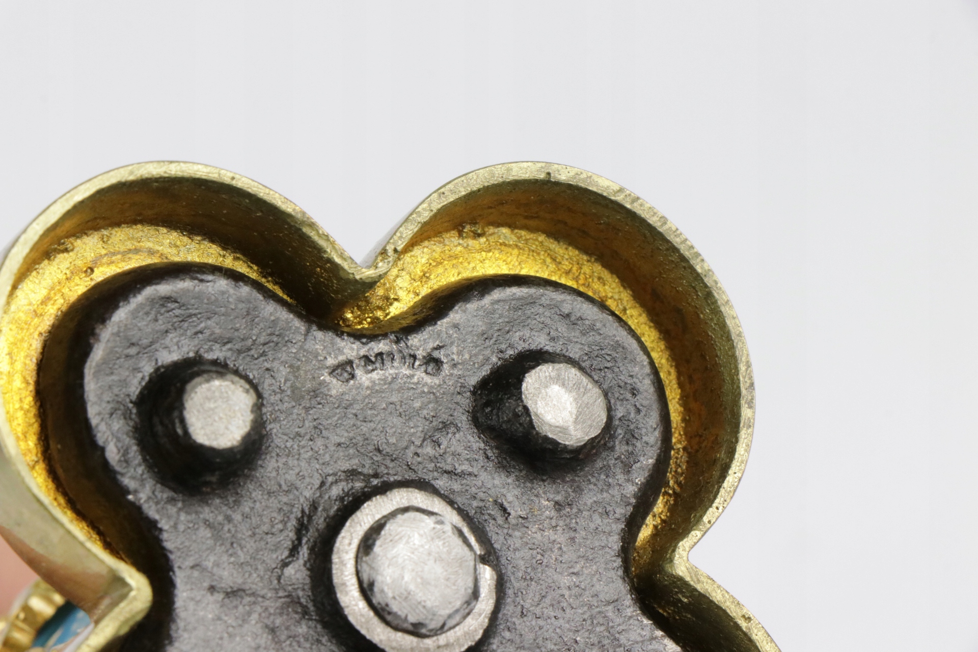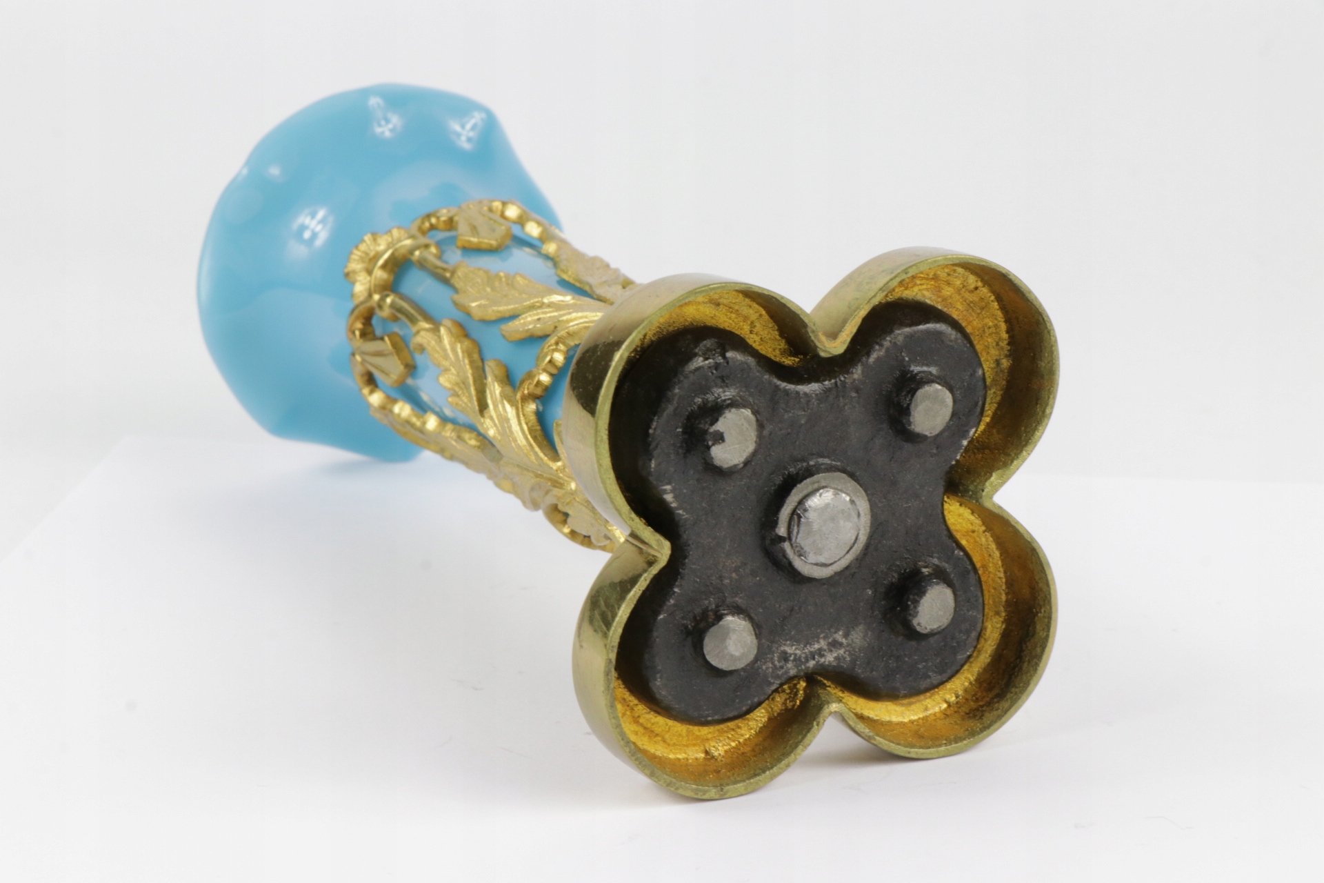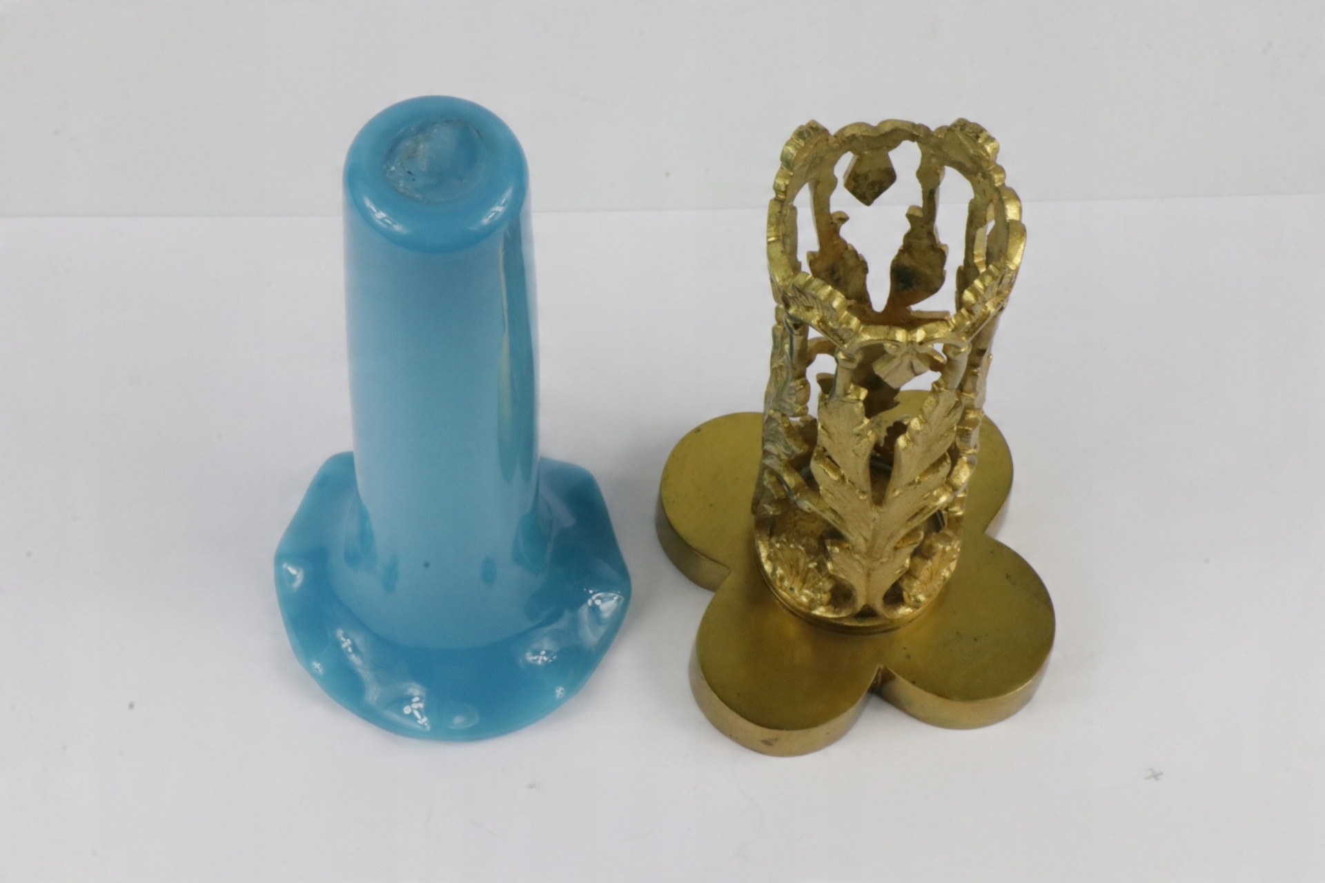 Ваза відлита з позолоченої бронзи зі скляною вставкою. Підпис внизу важко прочитати.