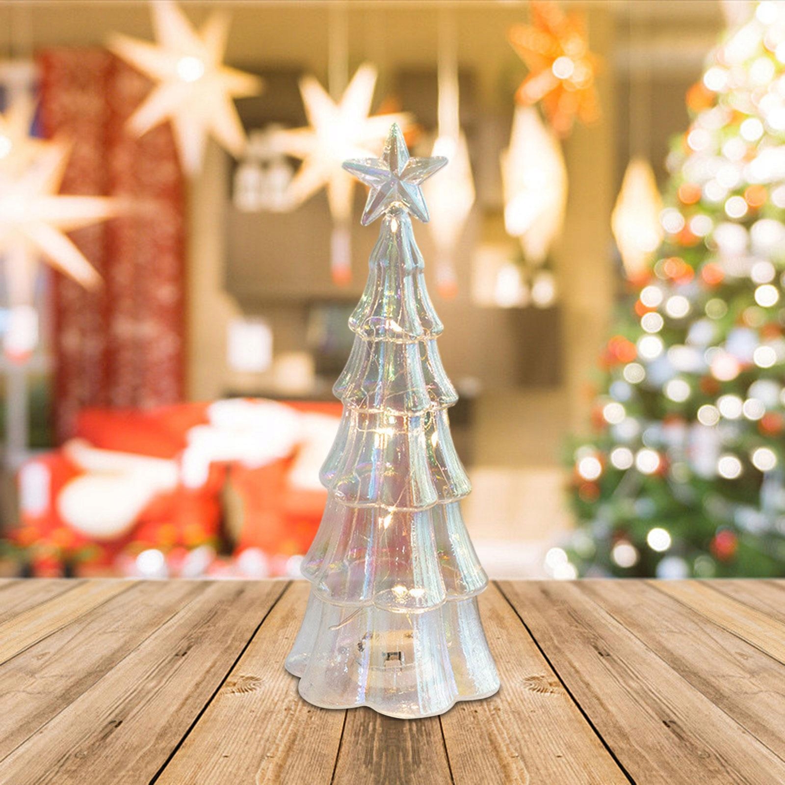 [ялинка на столі]: ялинка на столі з мерехтливим світлом всередині скляної ялинки, придатною для прикраси столу, столу, полиці, каміна тощо.