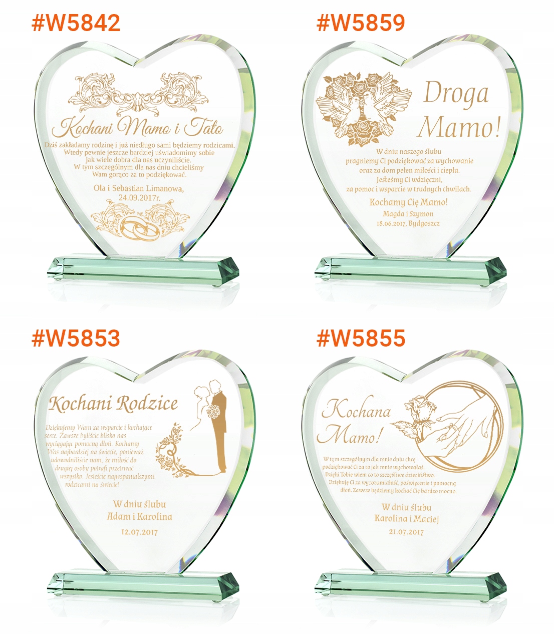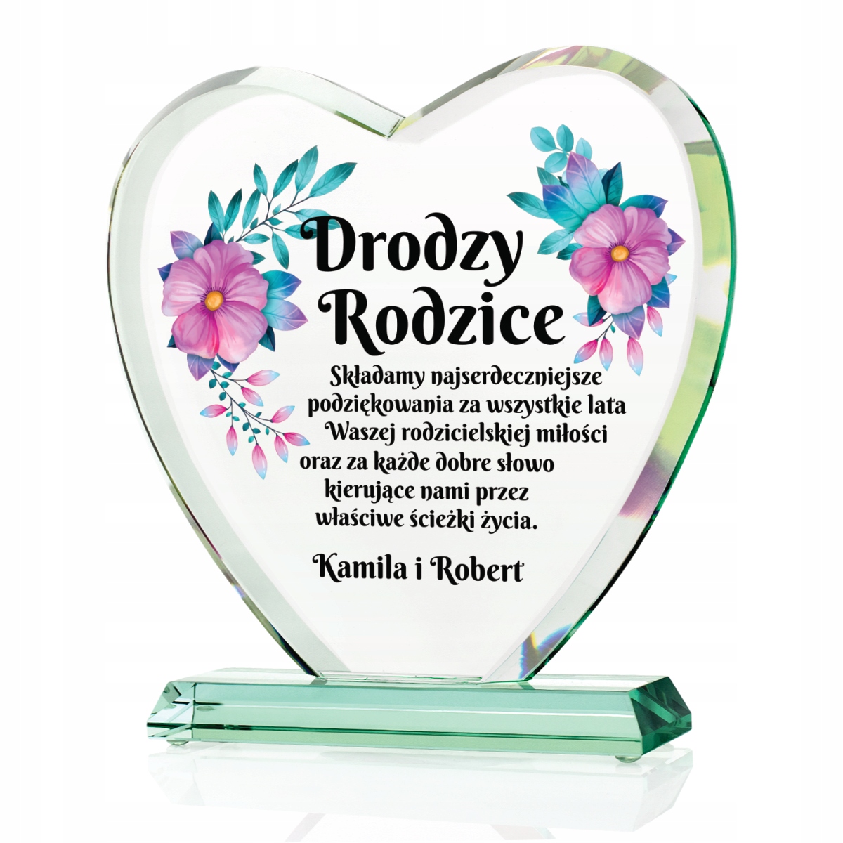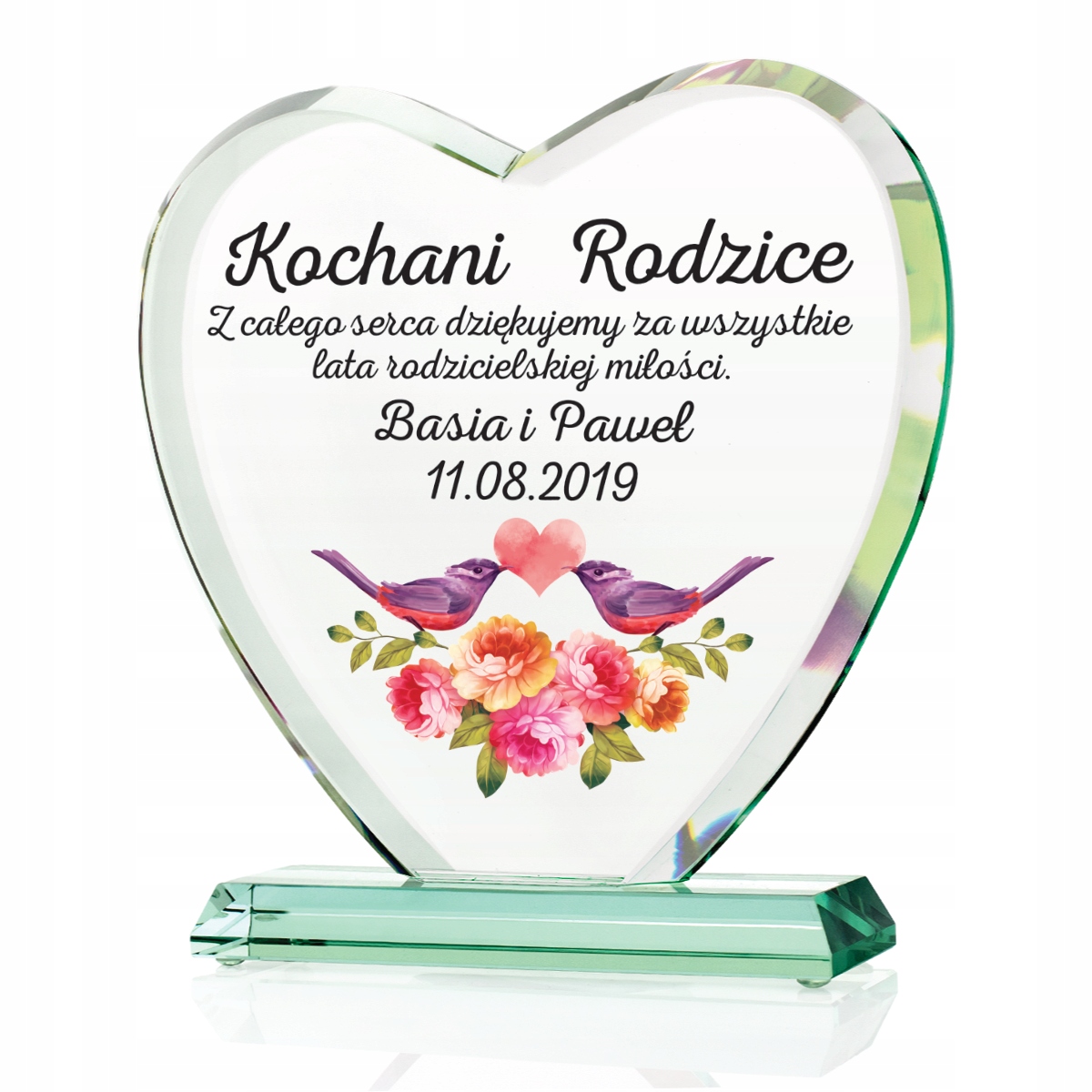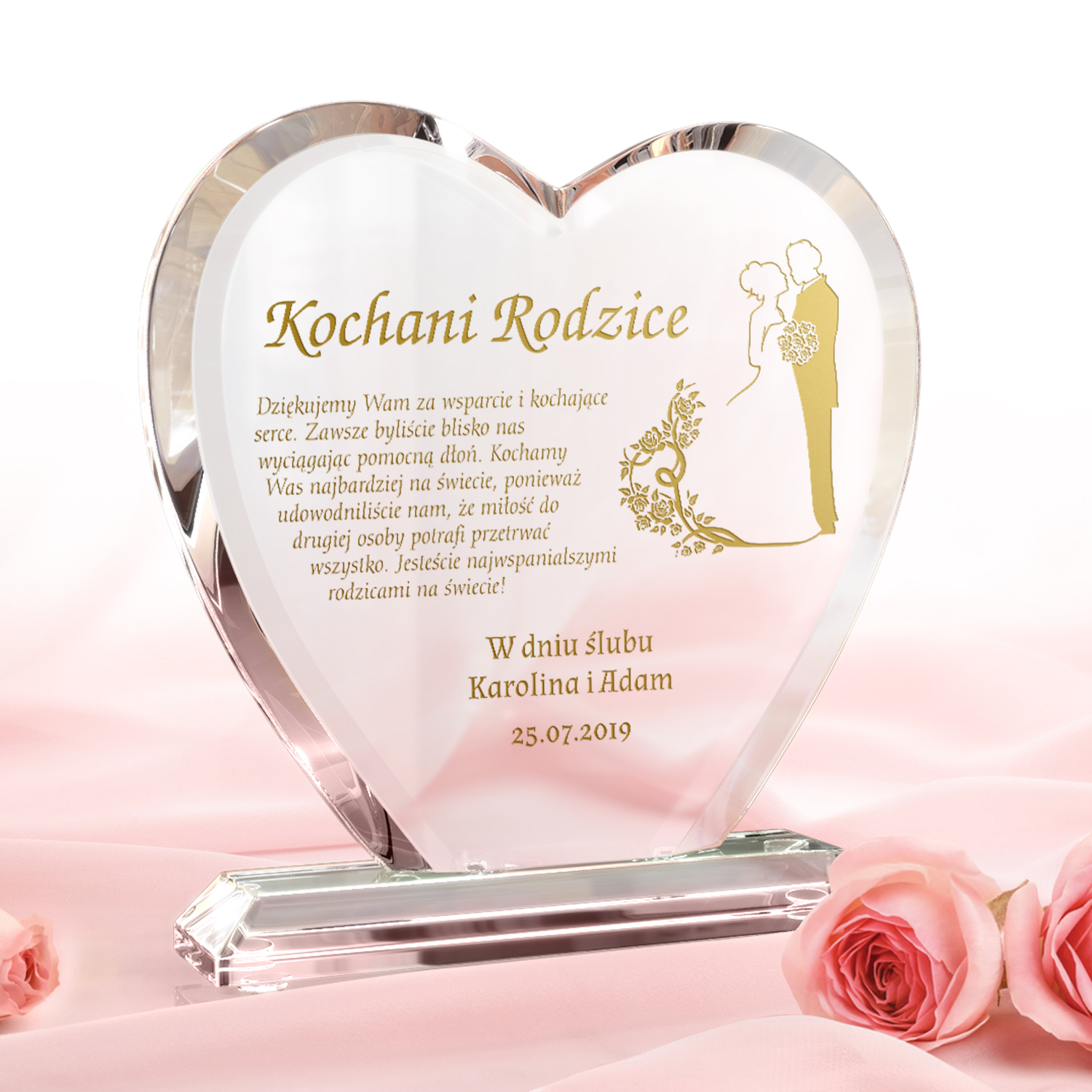 Елегантна статуетка у формі серця з вигравіруваною або надрукованою присвятою — чудова ідея для подяки батькам. Висловіть свою вдячність і подаруйте їм красиву статуетку з побажаннями або додайте особисту присвяту. Гравірування позолочене ідеально впишеться у весільну атмосферу, тому подарунок буде унікальним. Скляне серце виготовлено з товстого скла, що робить його міцним і міцним. Упакований в елегантний корпус сапфірового кольору, він підкреслить ефект майстерності та золотого гравіювання