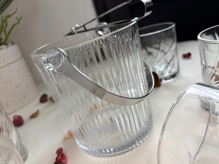 ✅Стильне відерце для льоду LUXITO Strips поєднує в собі елегантність і практичність, створюючи ідеальний аксесуар для людей, які цінують вишуканий дизайн. Він виготовлений з високоякісного прозорого скла з привабливою смугастою текстурою, яка чудово відбиває світло. Все це доповнюється міцною металевою ручкою, яка надає йому сучасного характеру та дозволяє зручно переносити.