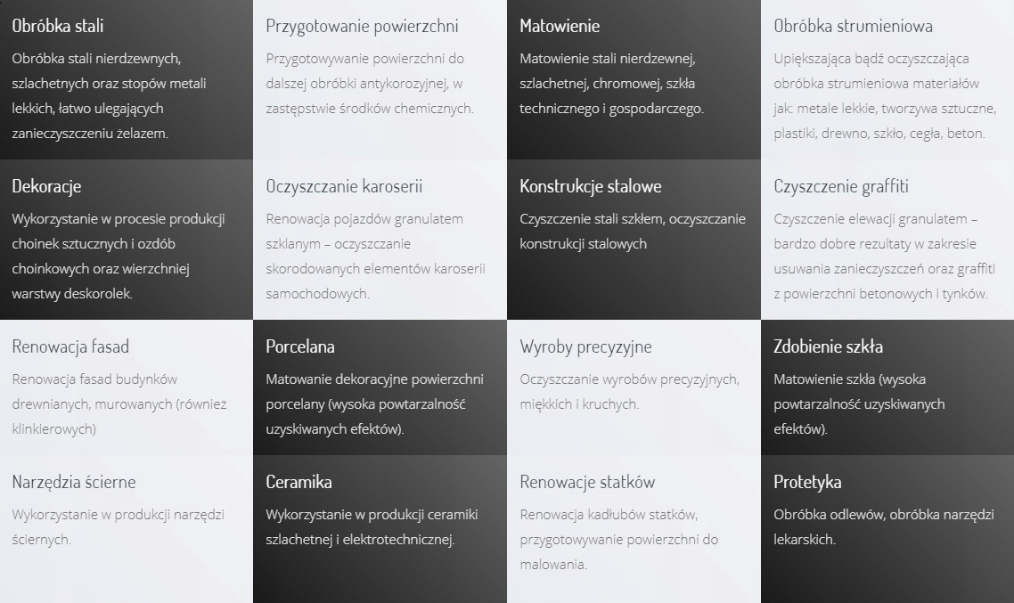 Пескоструминна зернистість є цінним абразивом завдяки своїй хімічній інертності, точності, чистоті та дуже низькому ступеню ерозійного стирання обробленої поверхні. Тому скляний гранулят Blast Grit знайшов багатьох покупців серед заводів, які здійснюють дуже спеціалізовану та точну обробку для авіаційної та автомобільної промисловості. Крім того, його цінують люди, які займаються художньою творчістю: скульптура, кераміка, порцеляна, обробка скла тощо.