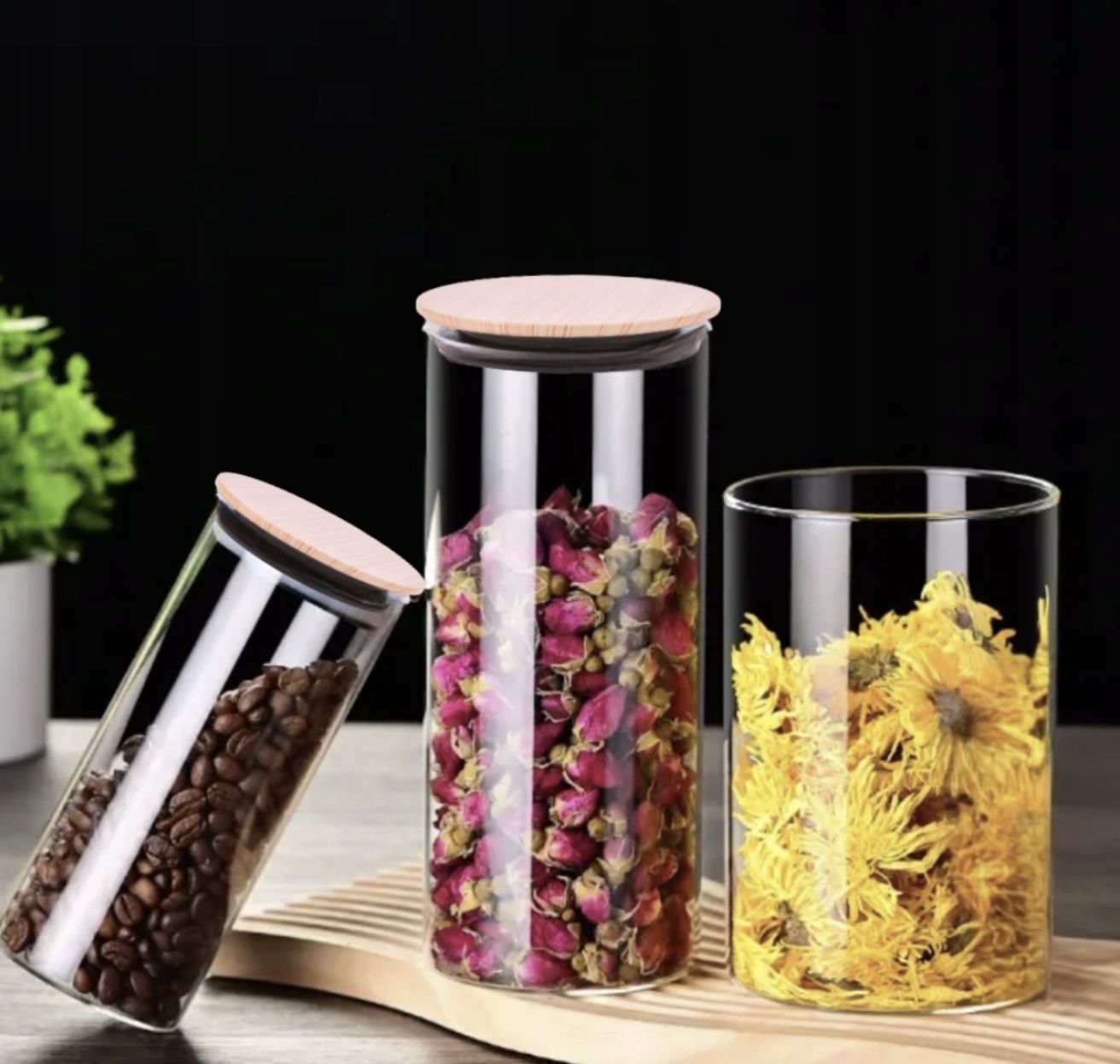 Скляна банка з дерев’яною кришкою з простою , класикою форми , ідеально вміщується як на сучасних, так і на більш традиційних кухнях. Контейнери на відкритих полицях на кухні. Це не тільки дозволить вам швидко знайти продукт , але й додати естетичне значення .
