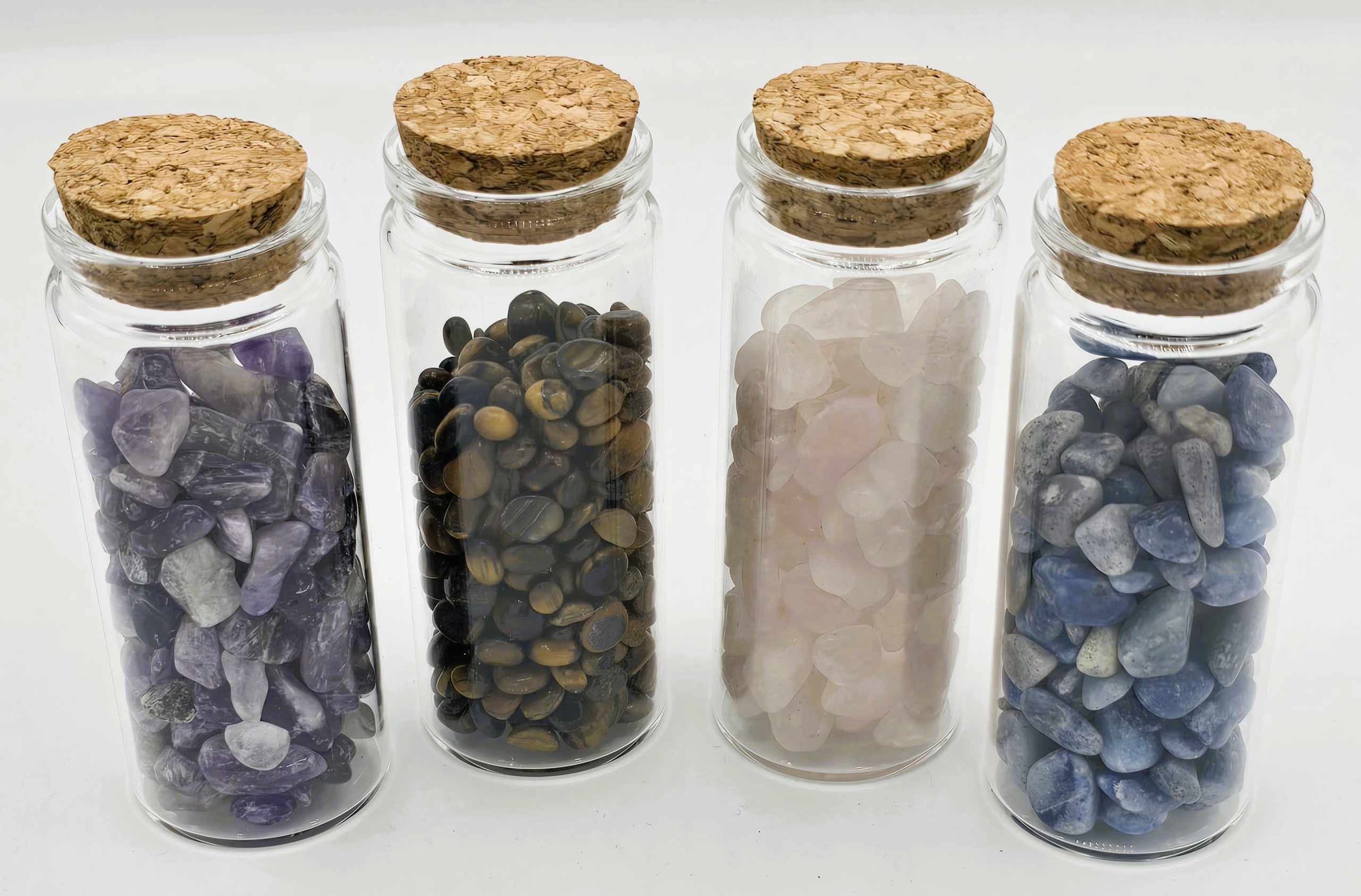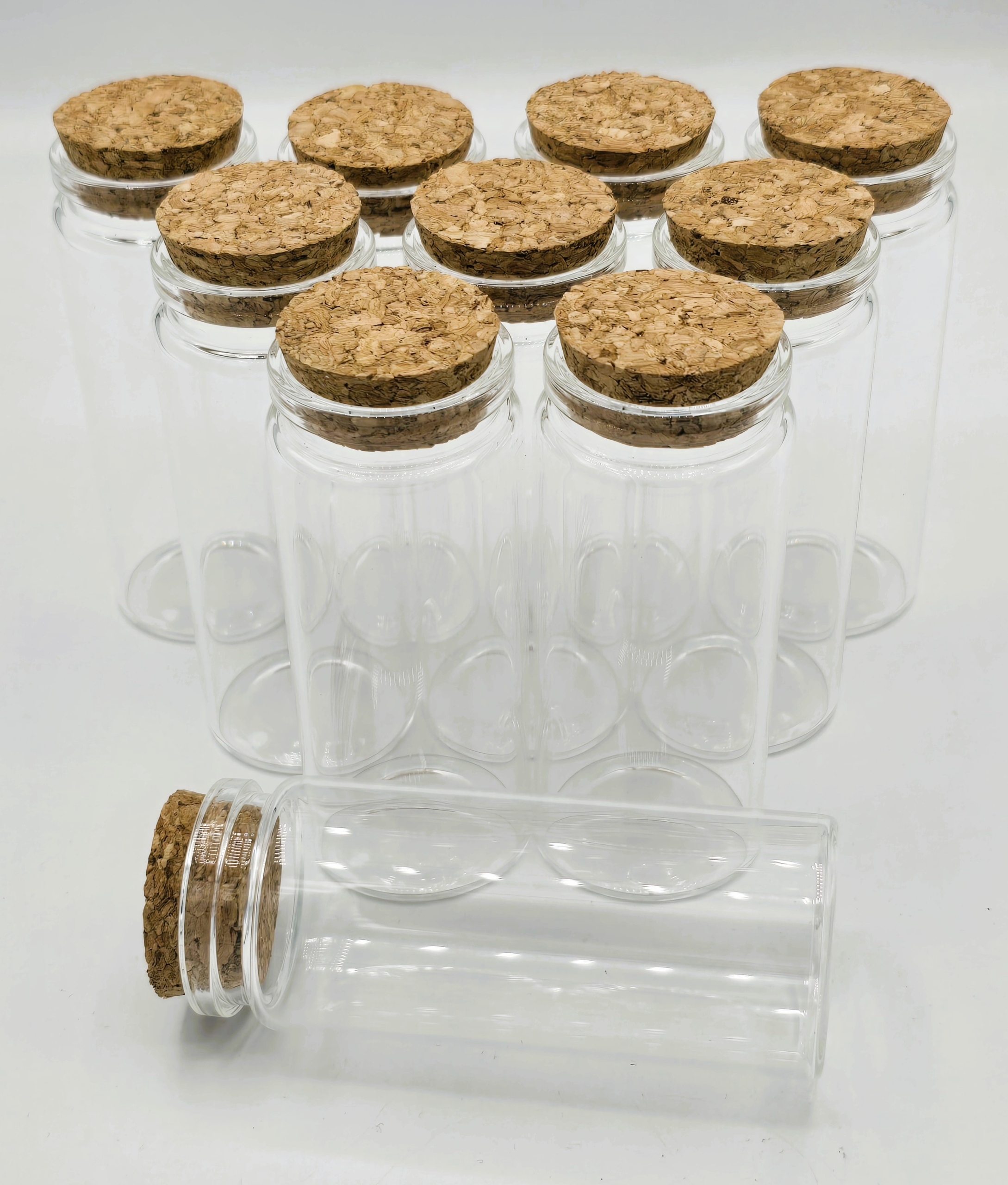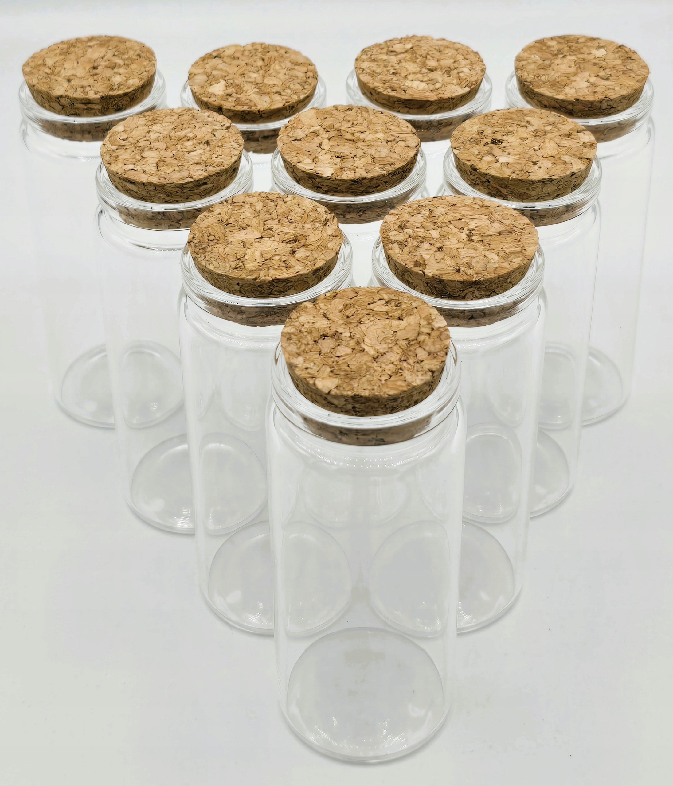 Набір з 10 прозорих скляних пляшок - банок з пробками.