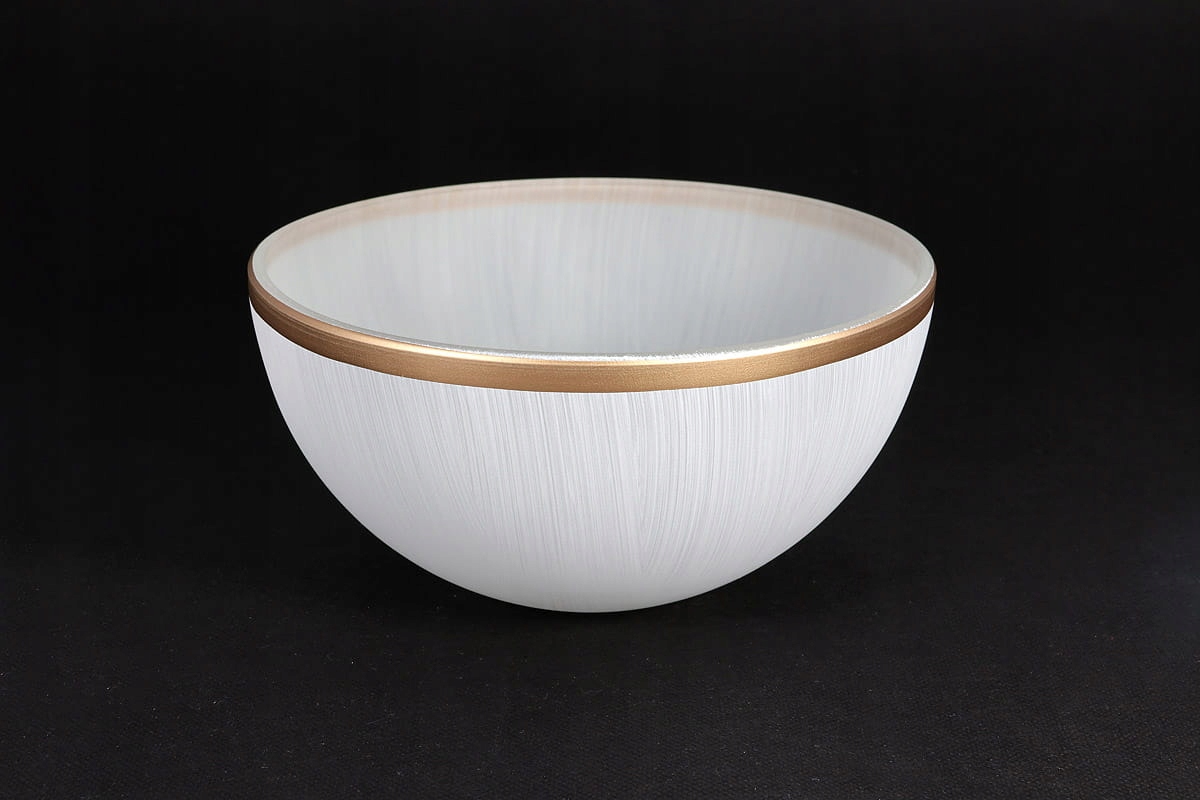 Абажур скляний у формі півсфери матового кольору з білим ефектом фарбування товстим пензлем. Край абажура з золотою смужкою.