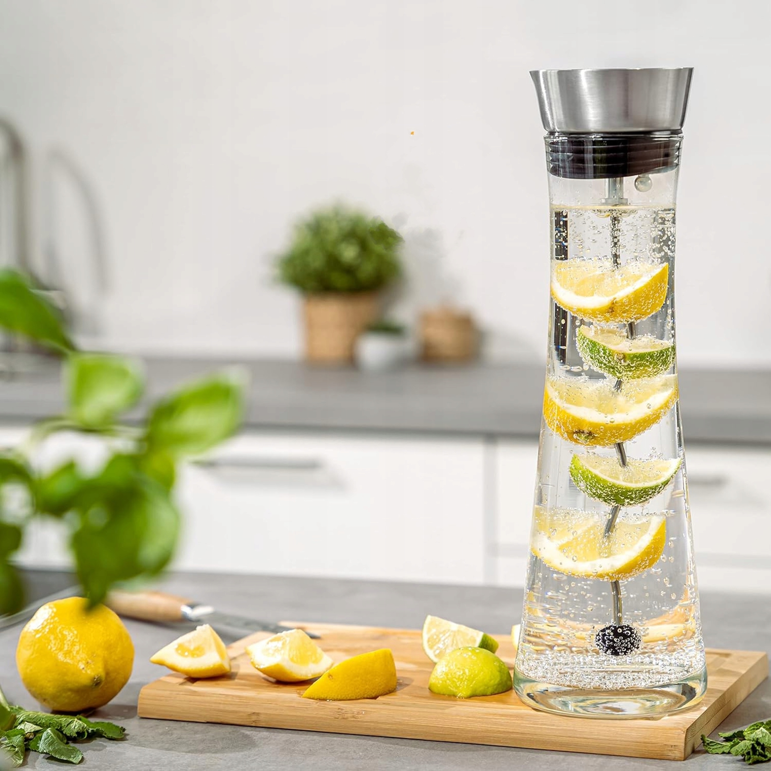 інтегрований ситечко, вбудований у горіх, полегшує виливання води і зупиняється всередині карафу з лимонних шматочків, кубиків льоду, листя м'яти тощо, зручно і зручно. Він також підходить для газованих напоїв. Легко заповнити. Ви можете мити в посудомийній машині.